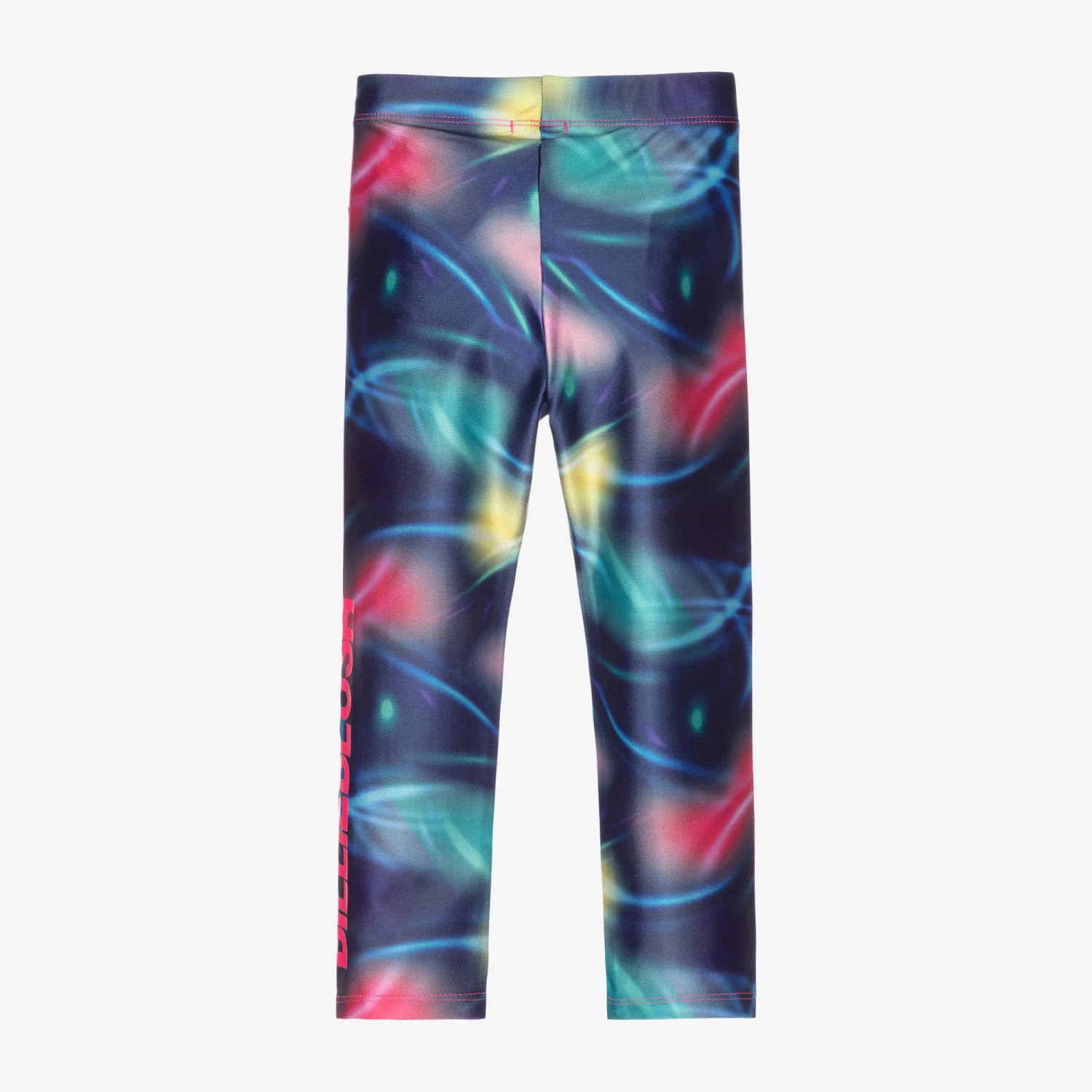 Silky smooth and stretchy leggings for girls by Billieblush, with a colourful all-over print. It has a neon pink logo print on one leg.