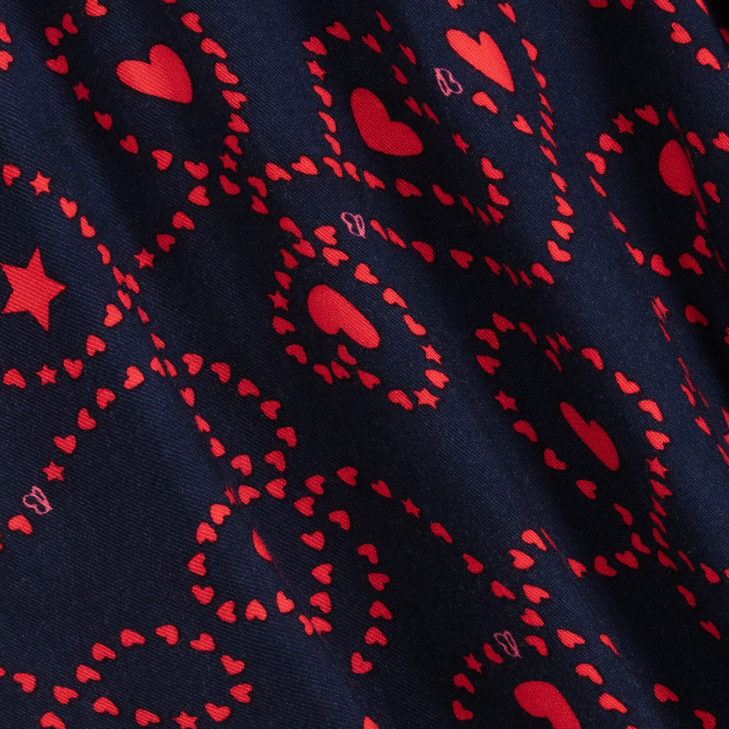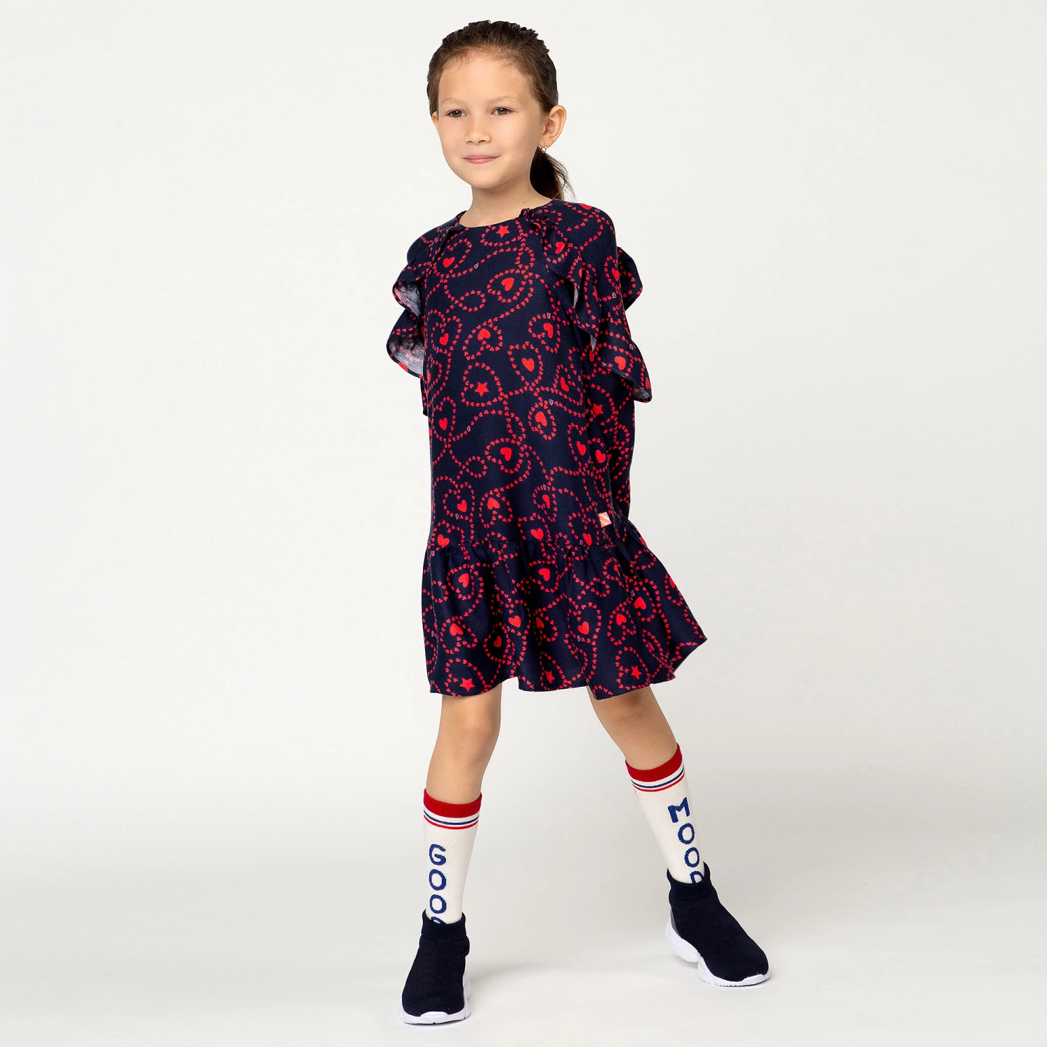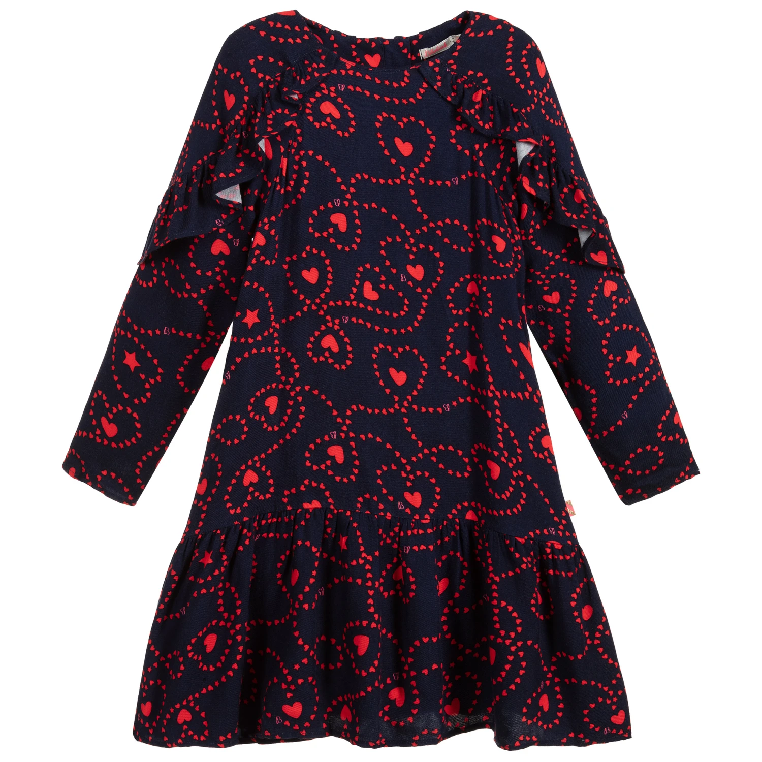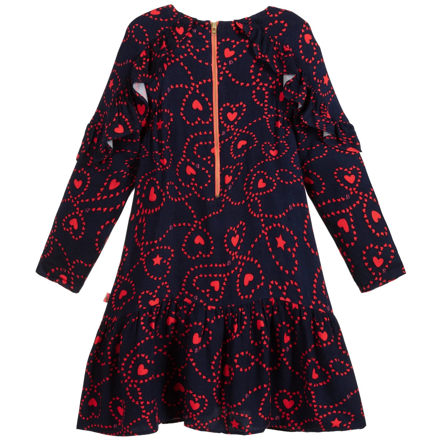 Girls lovely navy blue dress by Billieblush, with a red heart pattern. Made in soft viscose, it has ruffle detail and an exposed neon pink zip.