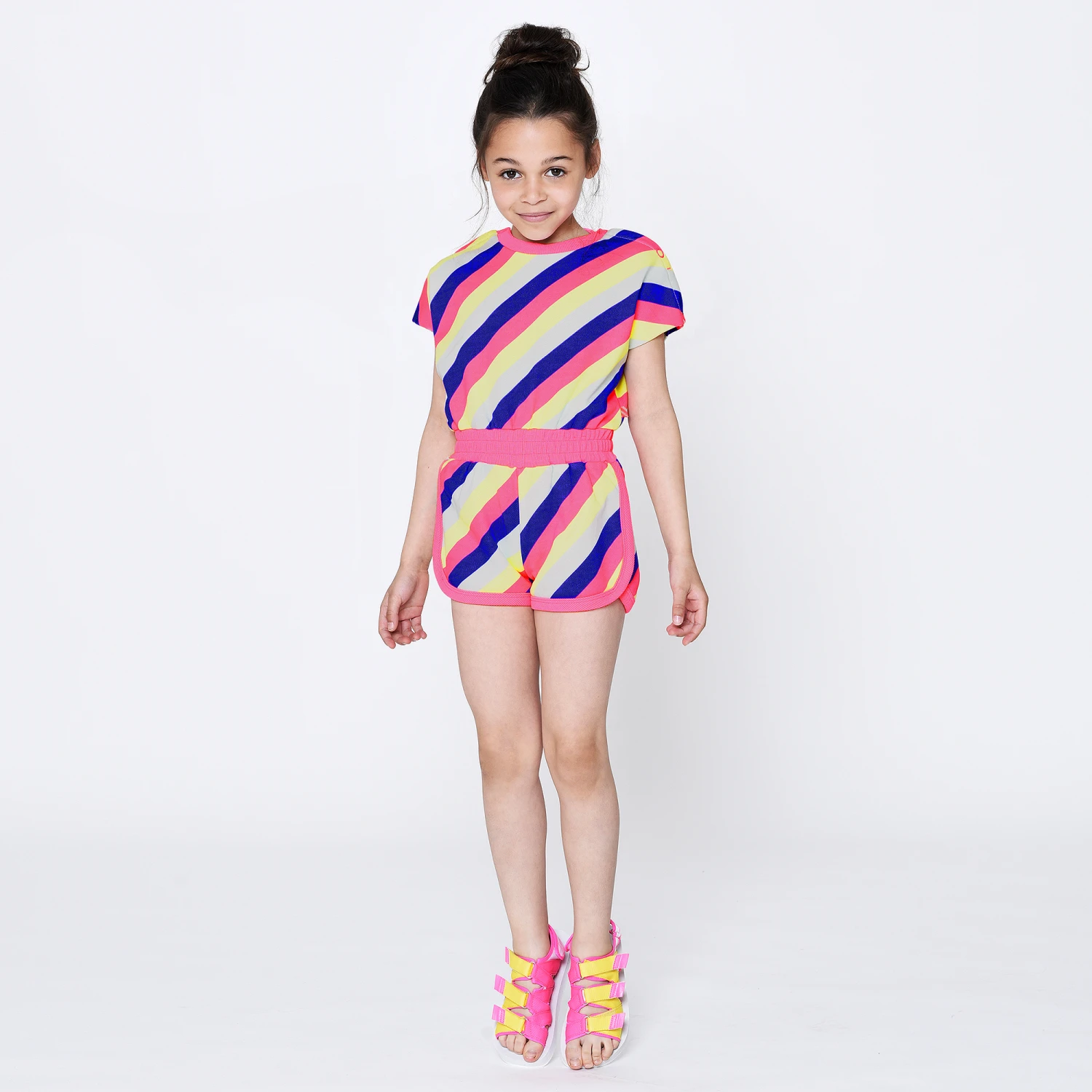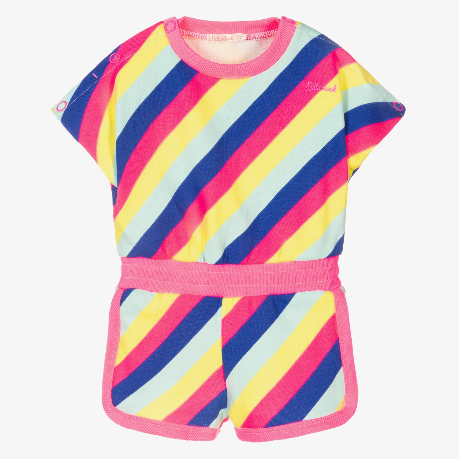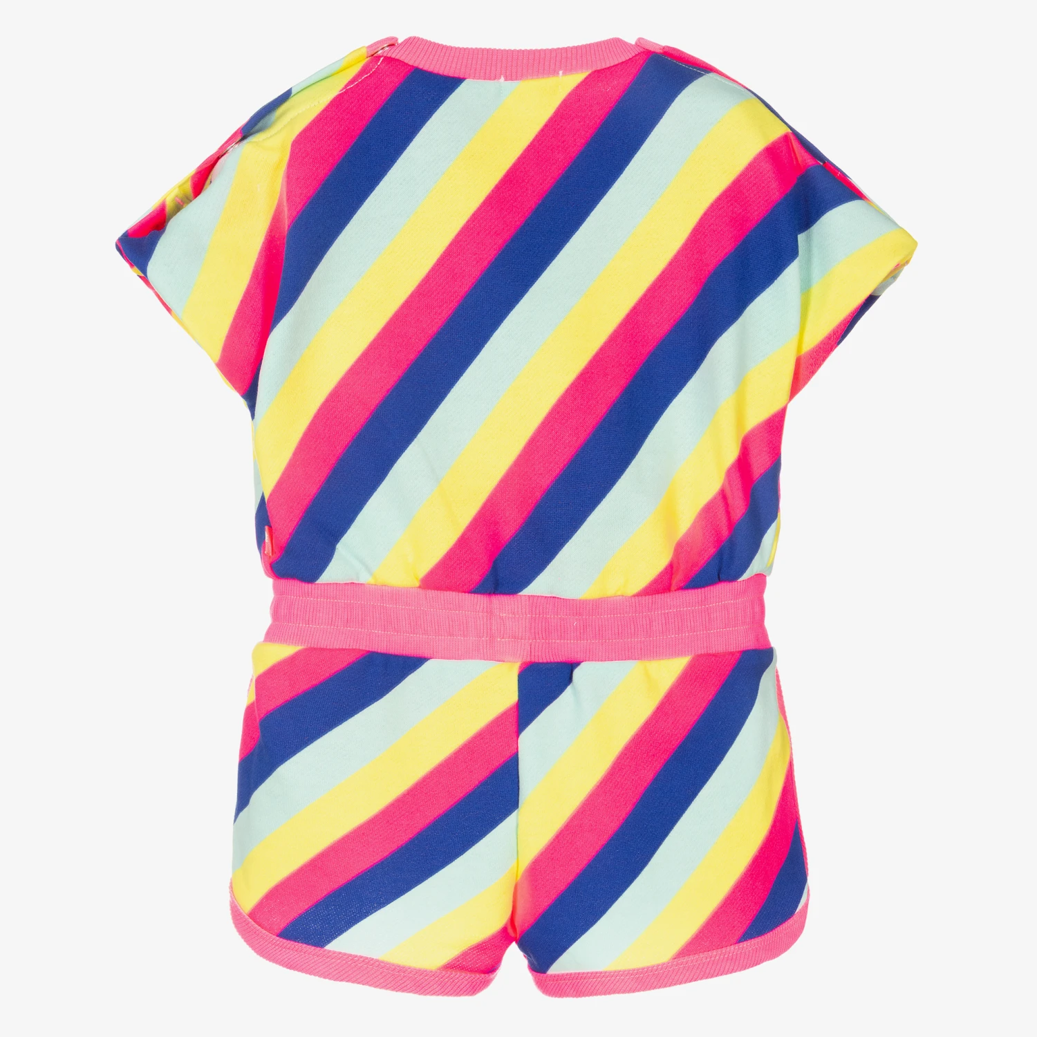 Eye-catching playsuit for girls by Billieblush, made in comfortable cotton sweatshirt jersey. It is trimmed in the brand’s signature neon pink, with neon pink, blue and yellow stripes. The brand’s pink rubberised logo is on the front, and both shoulders have popper fastenings.