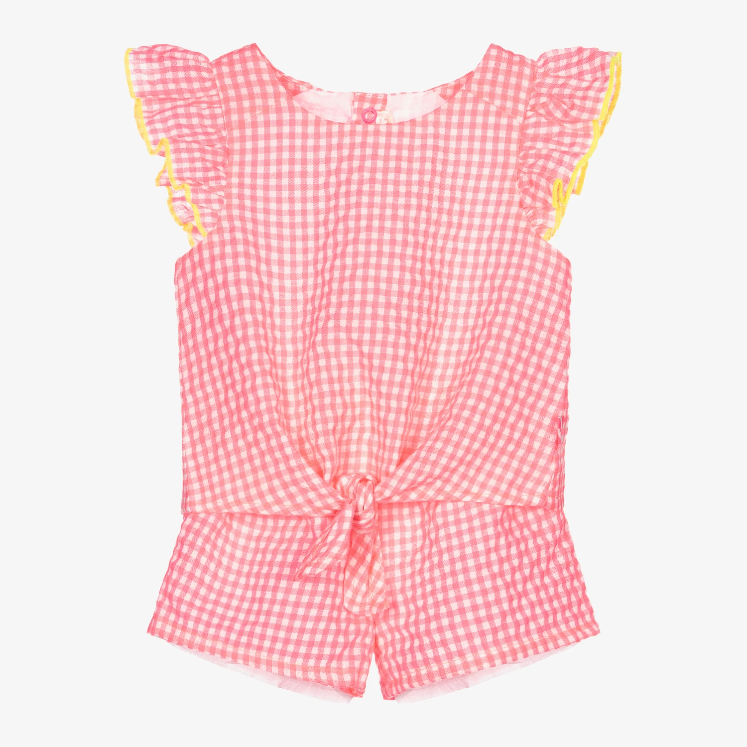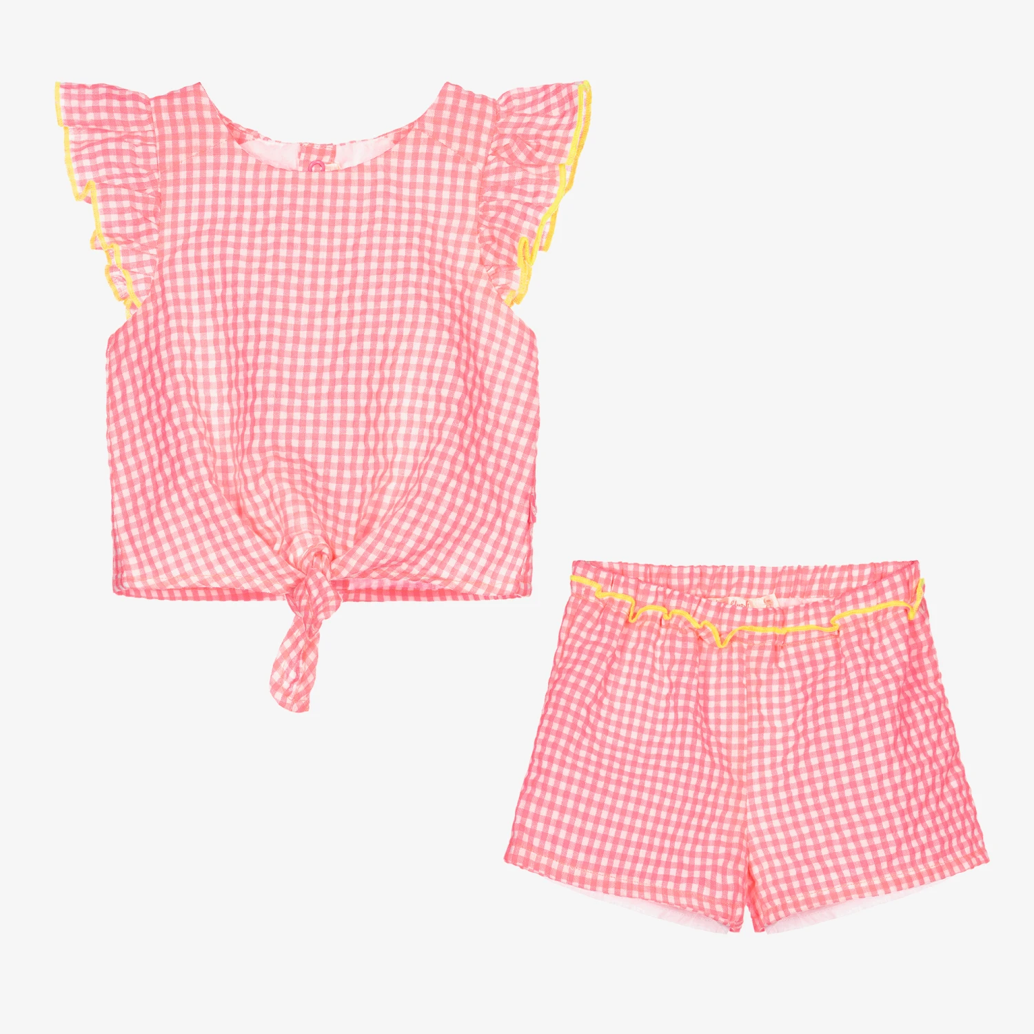 Fun neon pink gingham shorts set for little girls, by Billieblush. Made from soft, lightweight cotton, the top has neon yellow trimmed flutter sleeves, and a tie-up knot detail on the hem. It pairs with adorable matching neon pink gingham shorts with a matching neon yellow ruffle trim for a bold, colourful look.