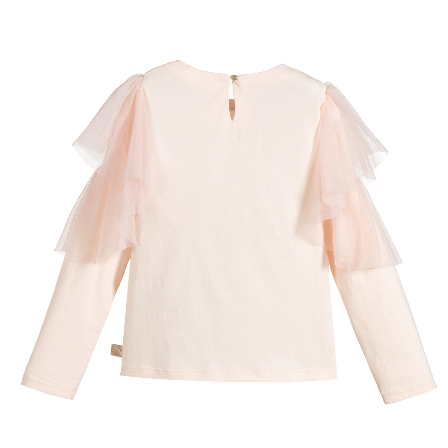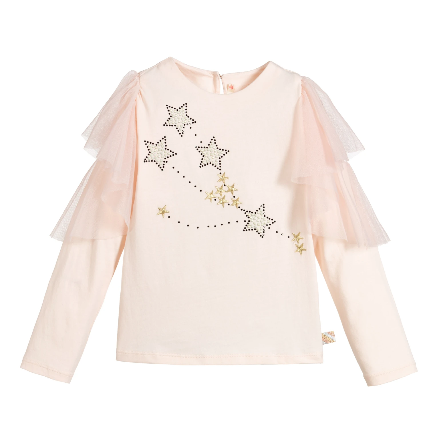 Pale pink top for girls by Billieblush. It is made in soft cotton-blend jersey with soft tulle on the sleeves. The front has a star design in black and gold, with pearl beads.