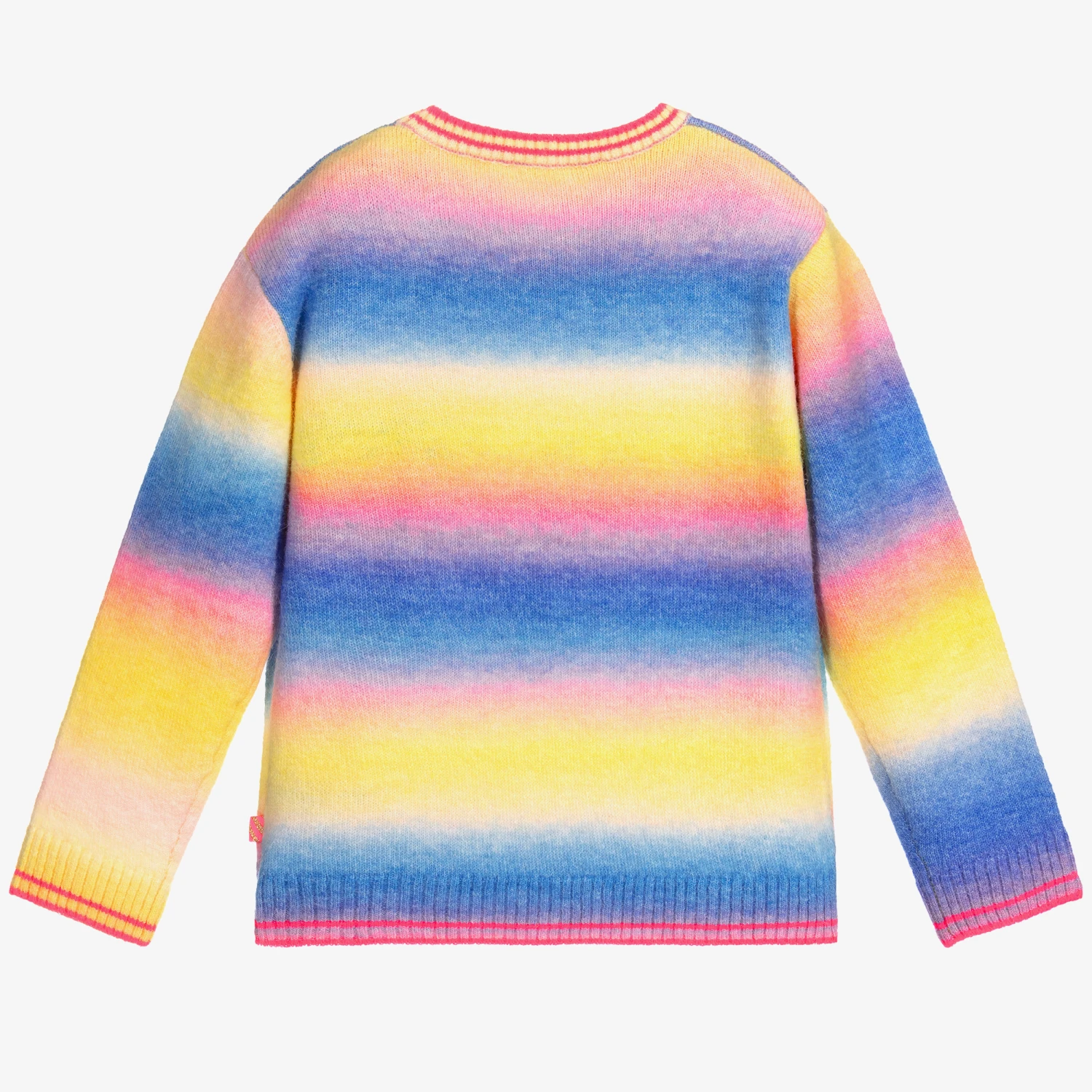 Lovely knitted jumper for girls by Billieblush, in pastel rainbow shades of pink, yellow and blue. Beautifully soft, it has a silicone star patch in pink and blue, and neon pink stripes on the ribbed trims.