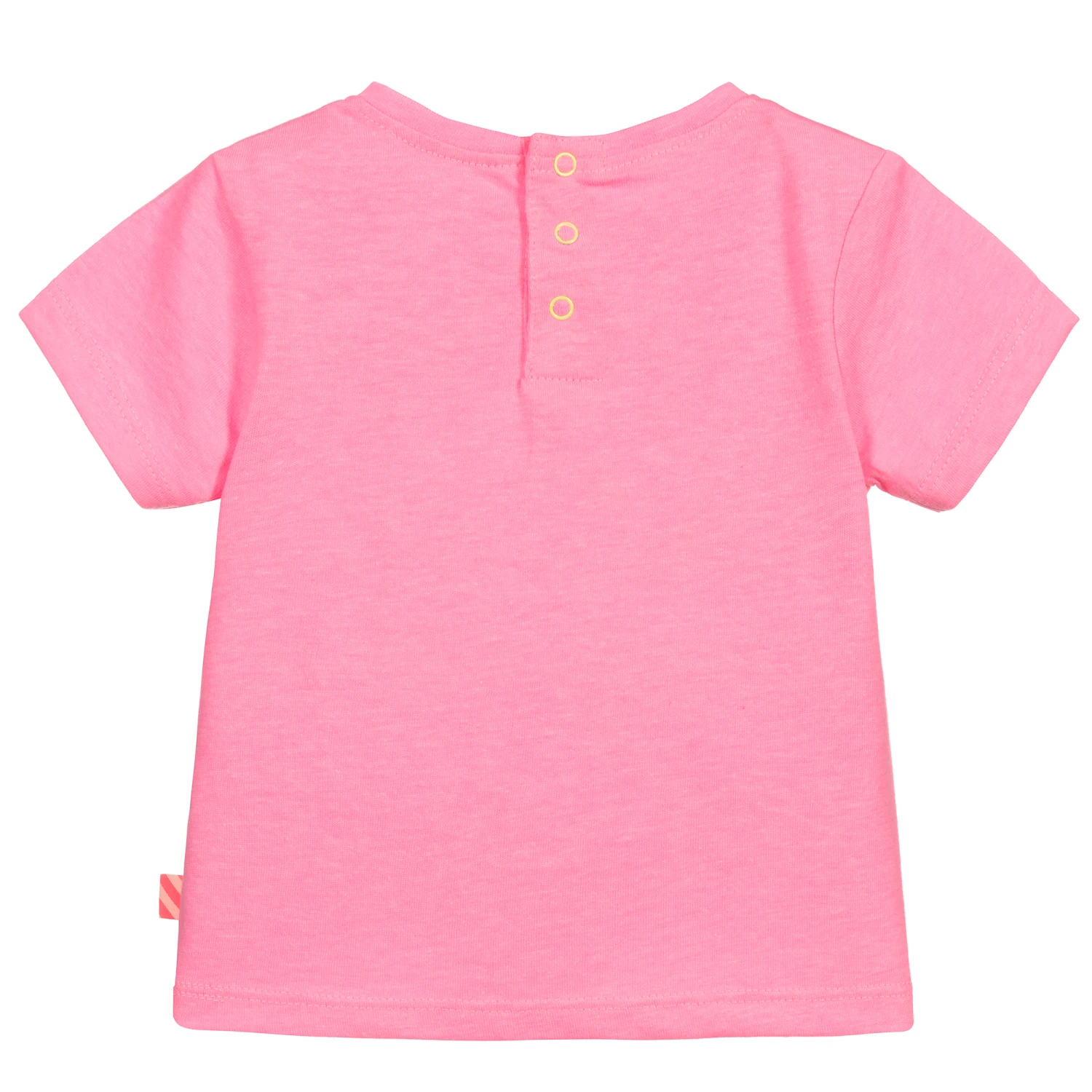 From Billieblush, a pale pink T-shirt for little girls, made in soft cotton jersey with neon yellow stitching. It has a fun seashell print in neon pink and yellow with white tulle trim.