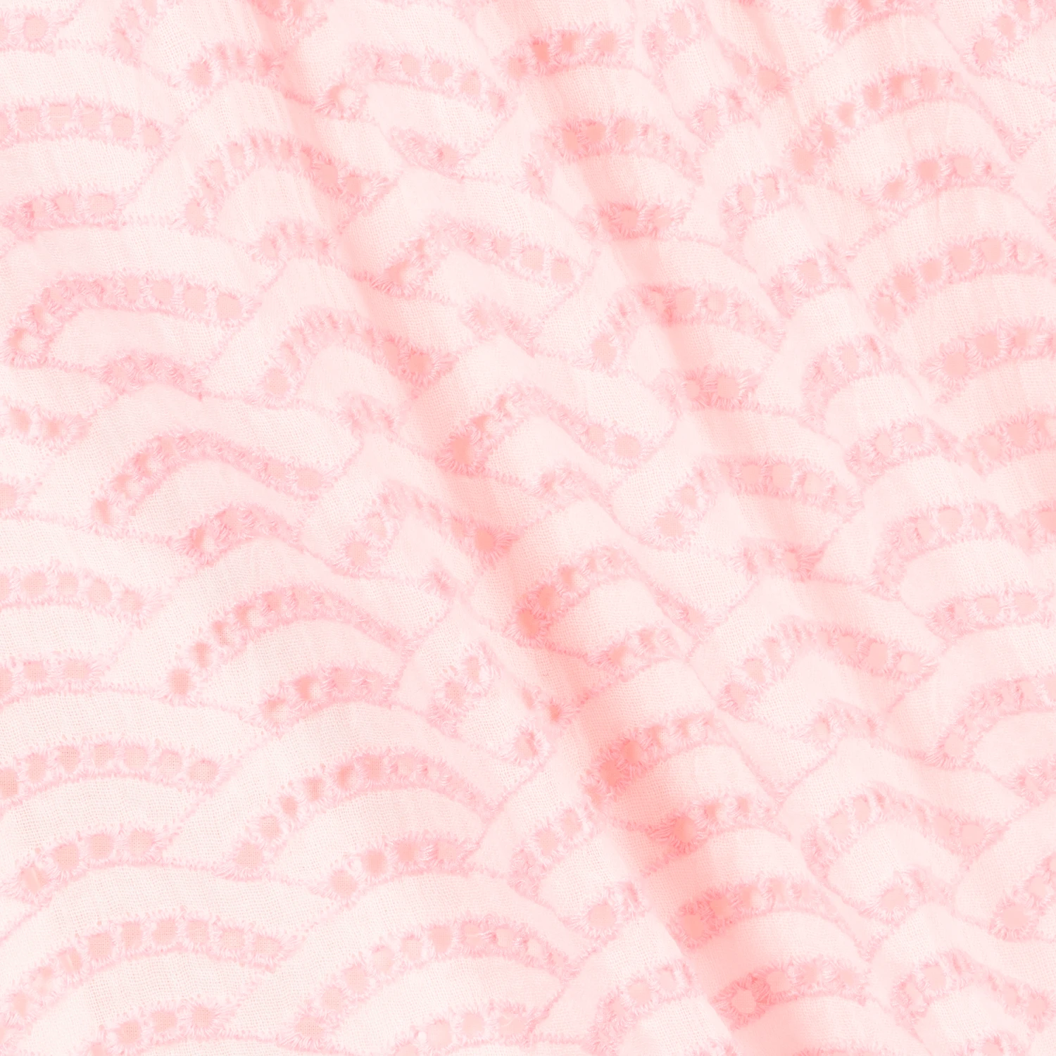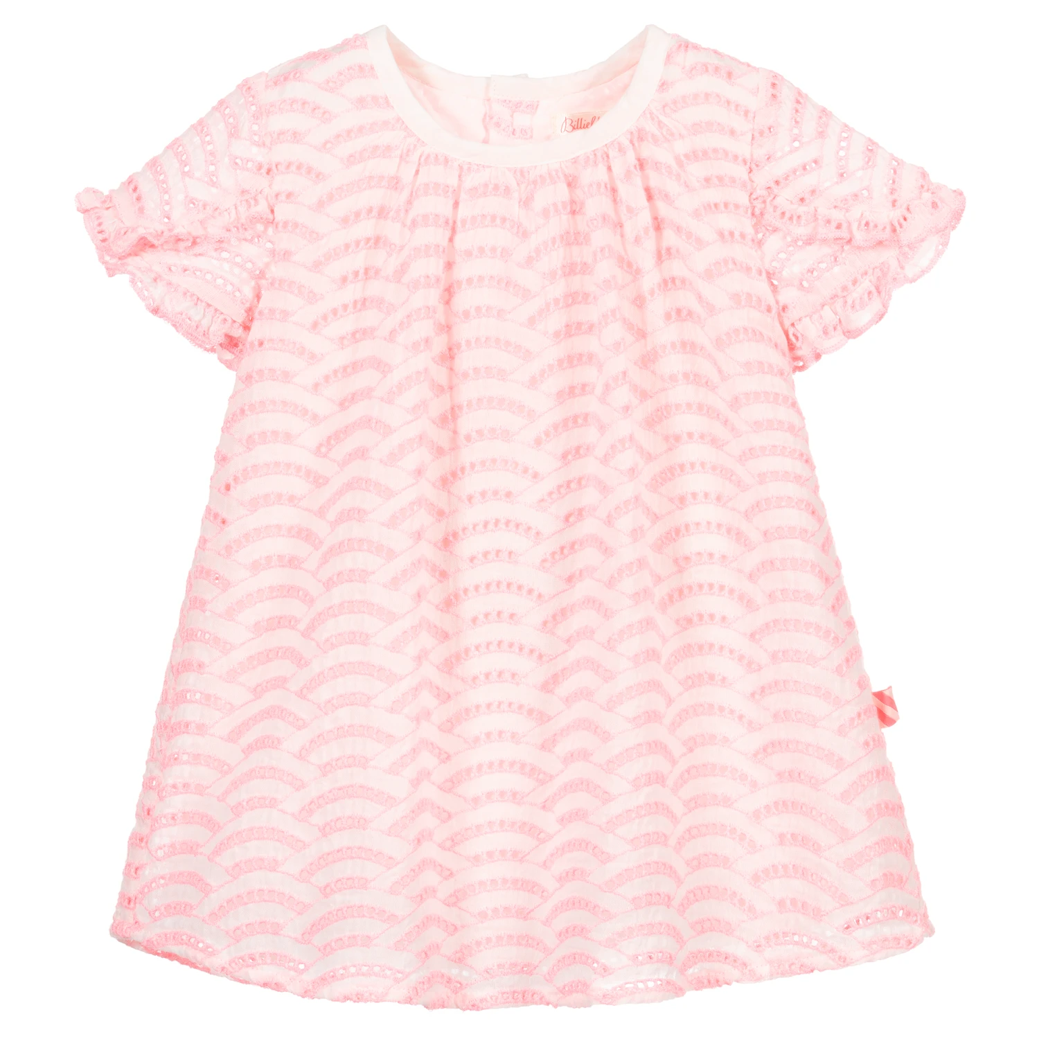 Pretty pink dress for younger girls by Billieblush. Made in lightweight cotton, it is patterned with lovely cut work and embroidered with pink thread. It has a white trim around the neckline and frilled sleeves. There are pink button fastenings on the back, edged with gold glitter.