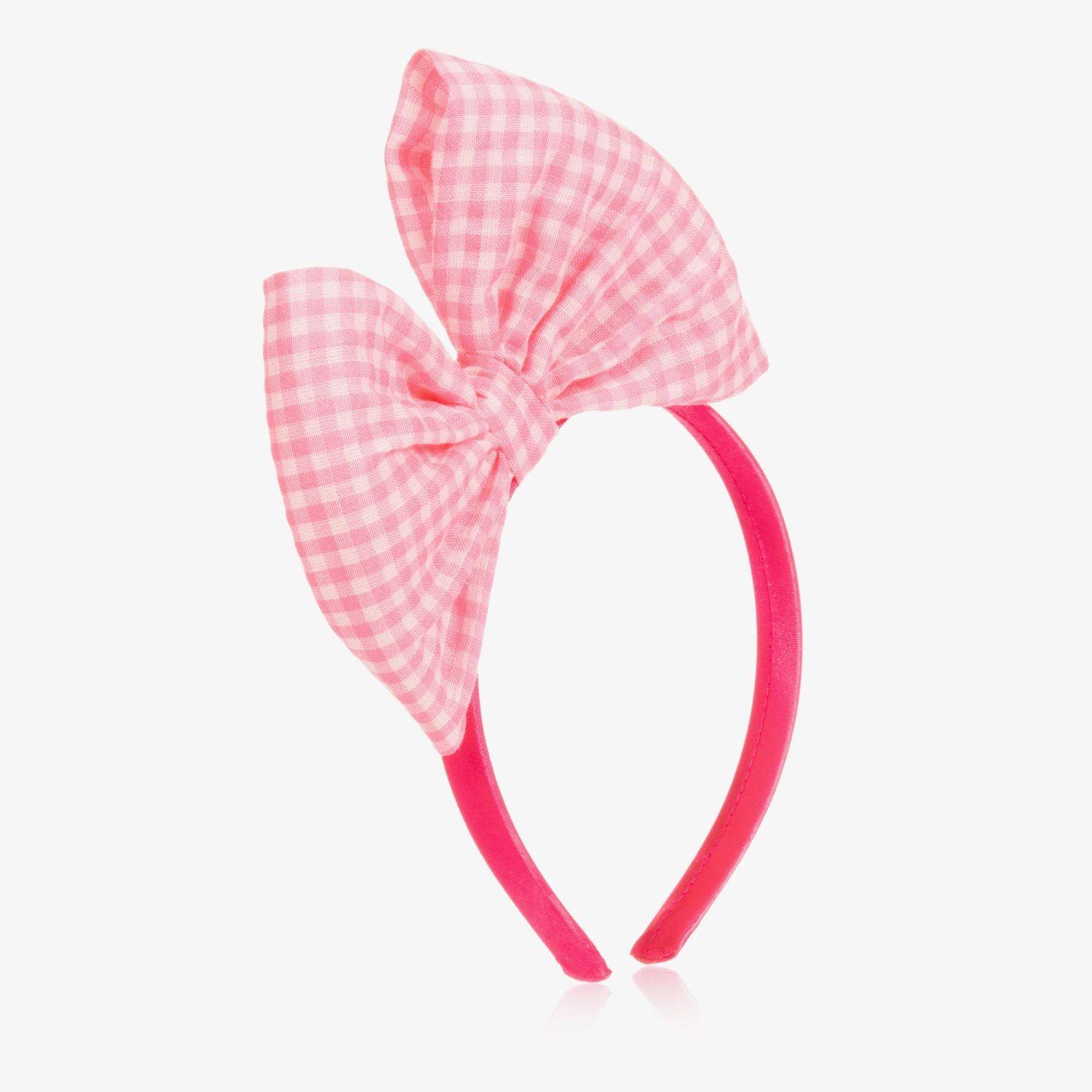 Pretty neon pink hairband for girls by Billieblush. The flexible band is covered in fuchsia pink satin and there is a large neon pink and white gingham bow on one side.