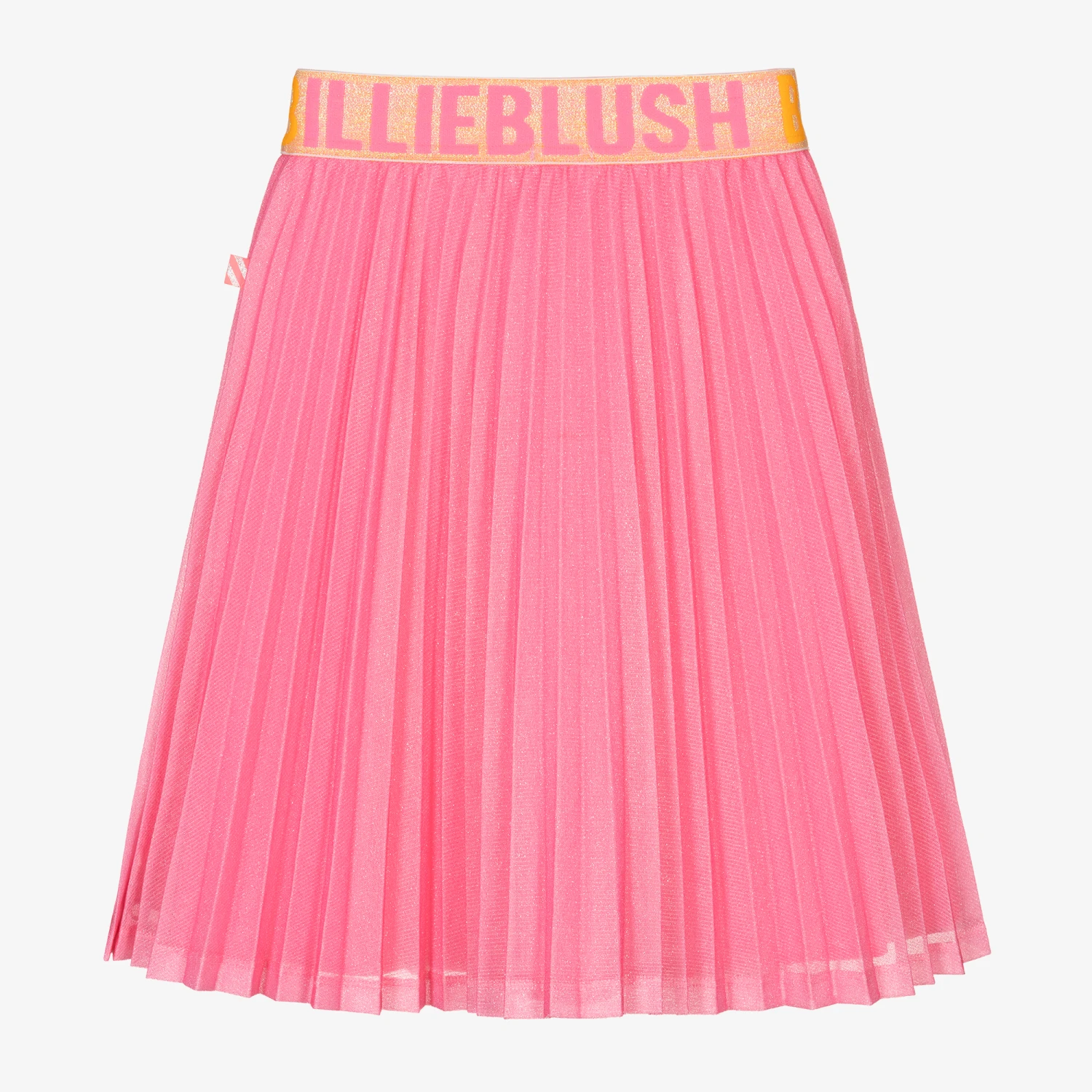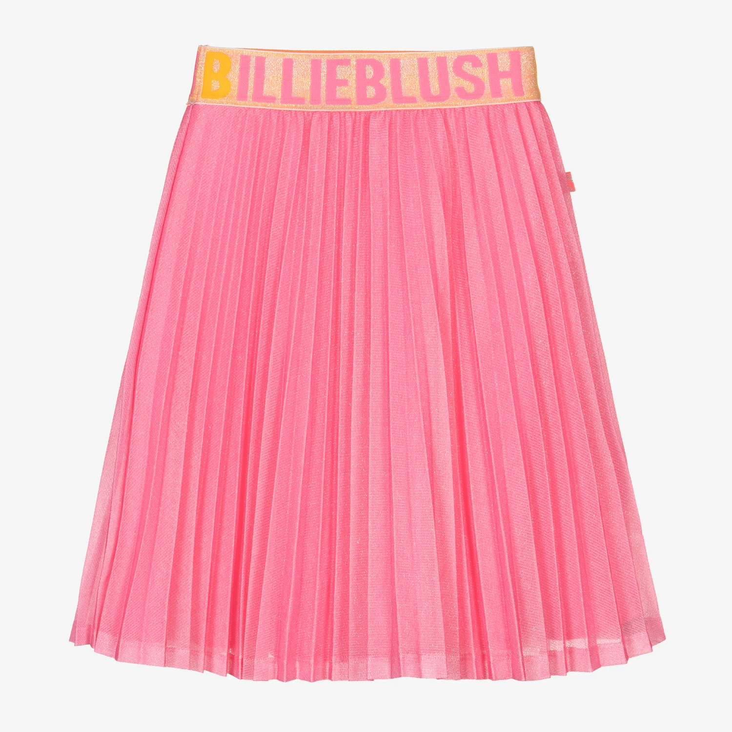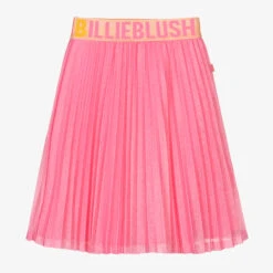 Bright pink pleated skirt for girls by Billieblush. It is soft and stretchy, with pretty glitter flecks and a sparkly logo jacquard waistband in neon pink and orange. It is lined with soft, lightweight fabric for comfort.