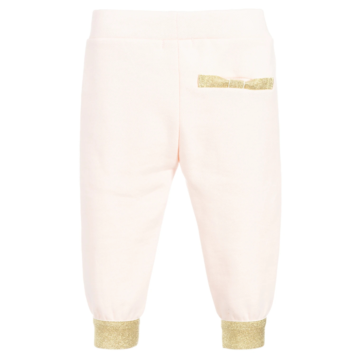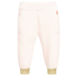 Pale pink joggers for little girls by Billieblush, made in soft cotton jersey. They have elasticated gold ankle cuffs and gold trim on the back pocket.