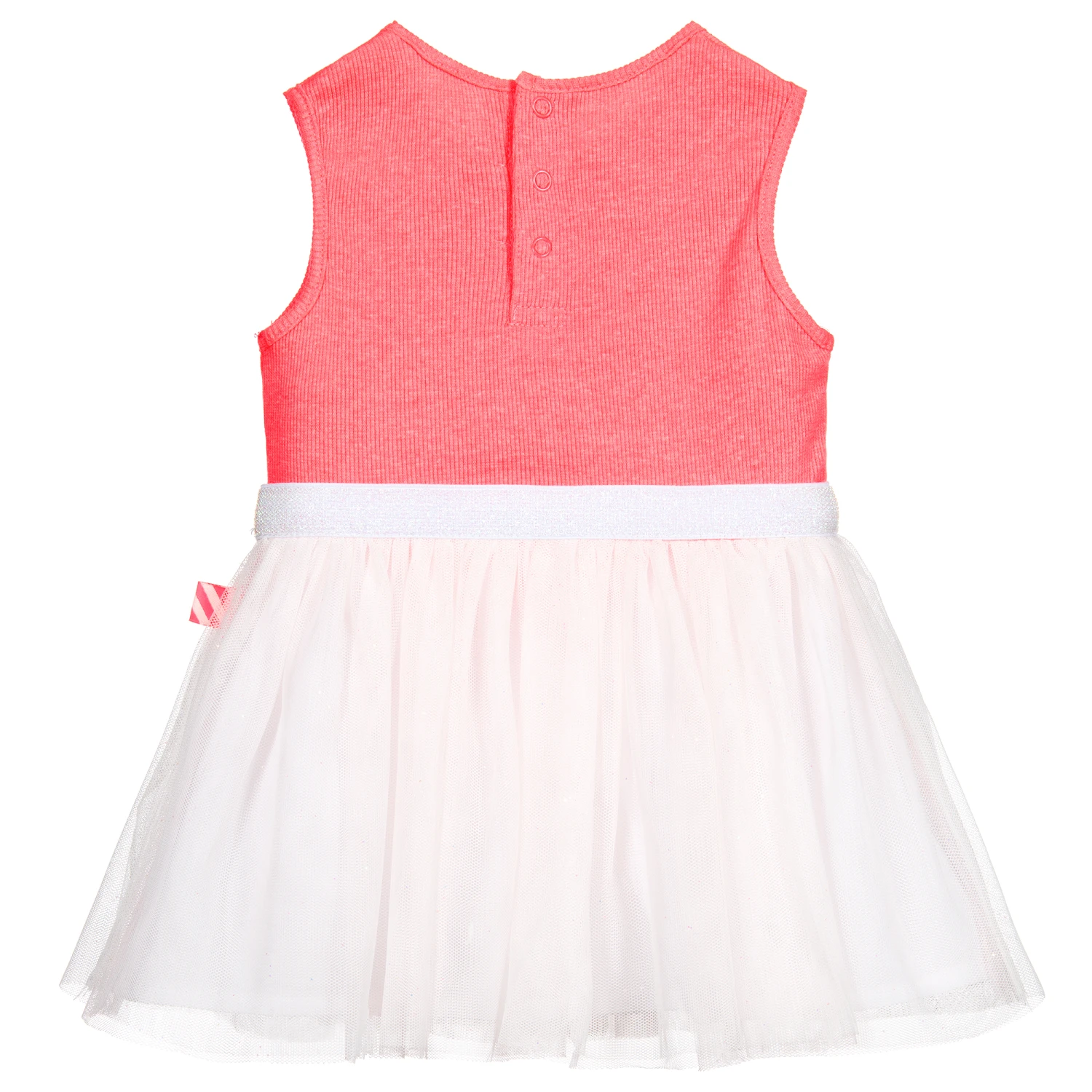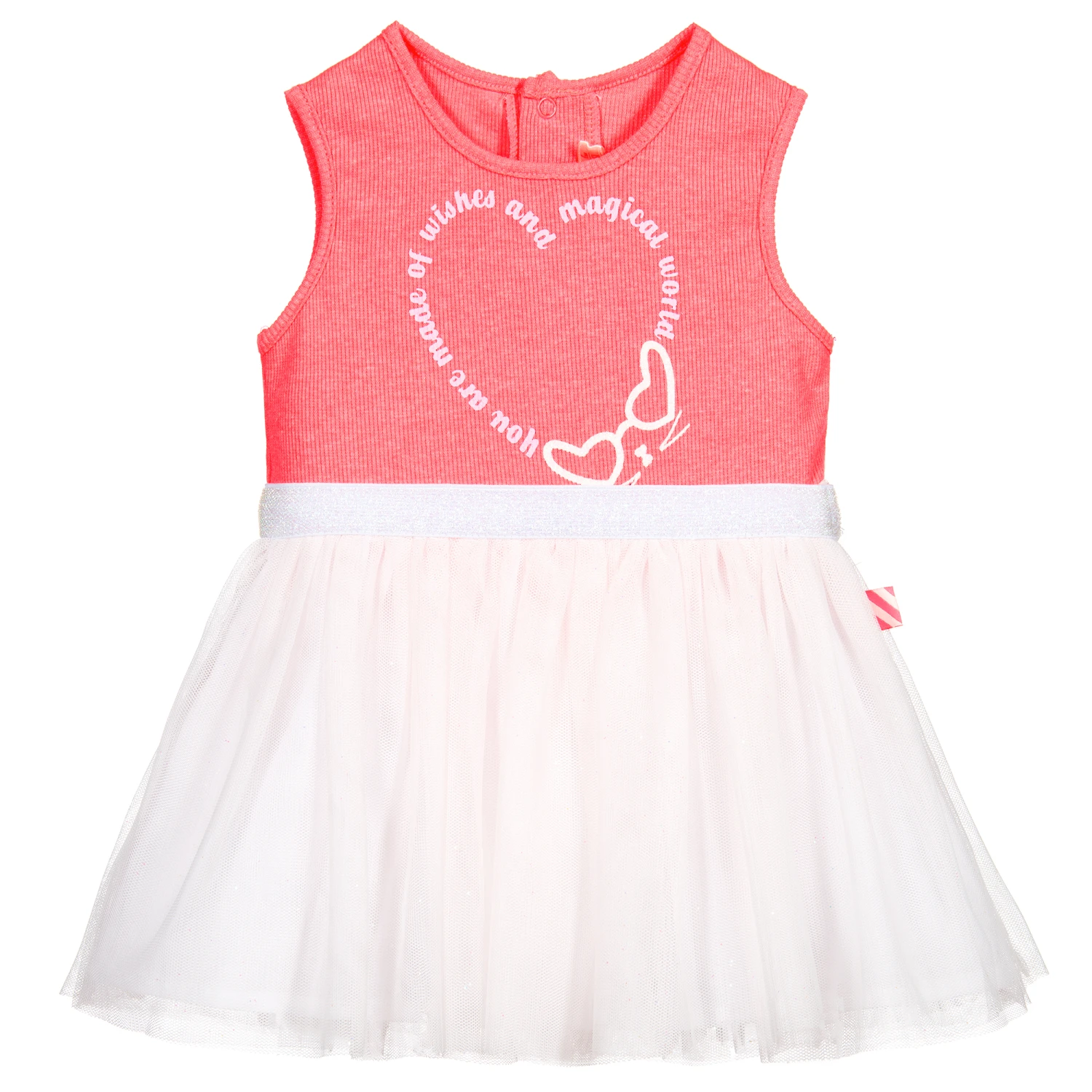 Neon pink and white dress for little girls by Billieblush. The soft, ribbed jersey bodice has a pink slogan print with white glittery hearts. The gathered skirt is made in soft white glitter tulle and the dress has an elasticated glitter waistband.