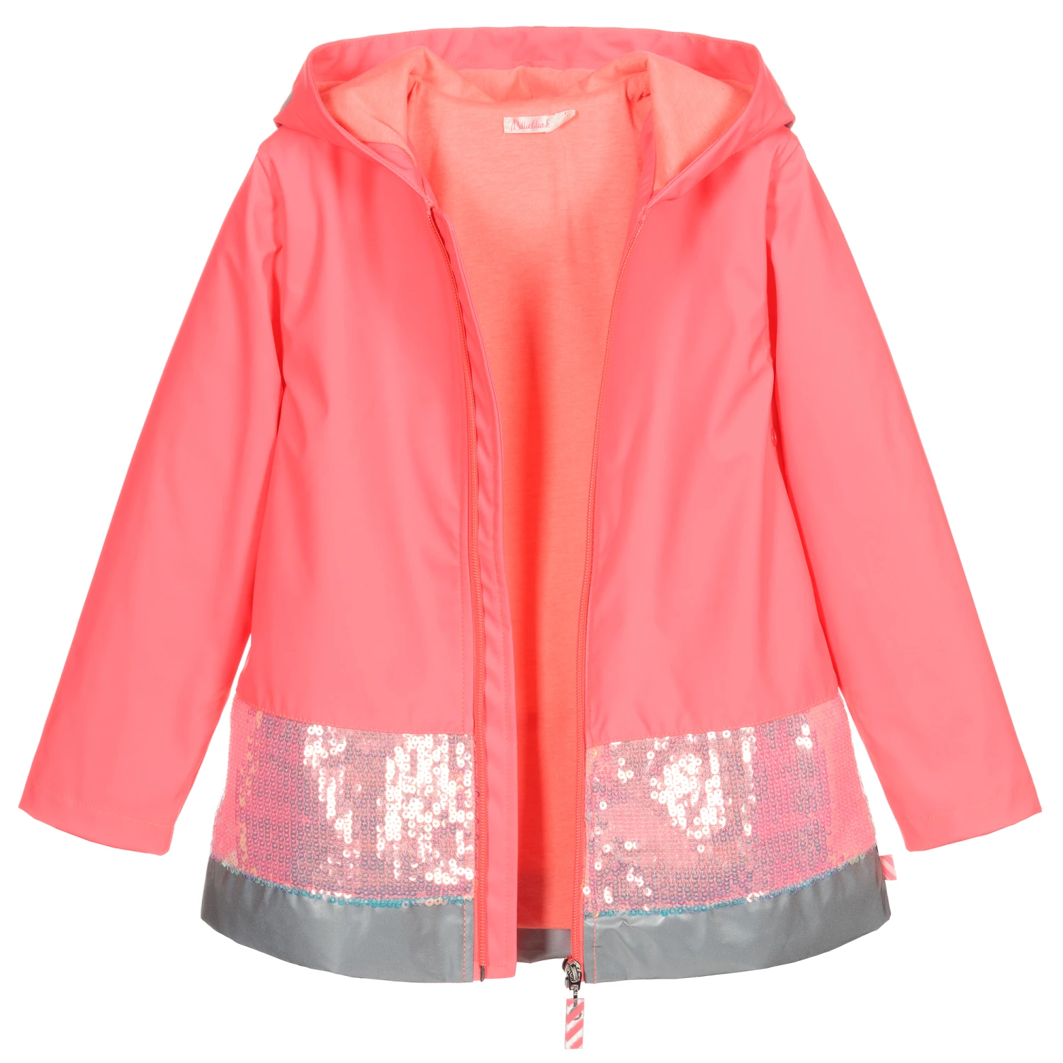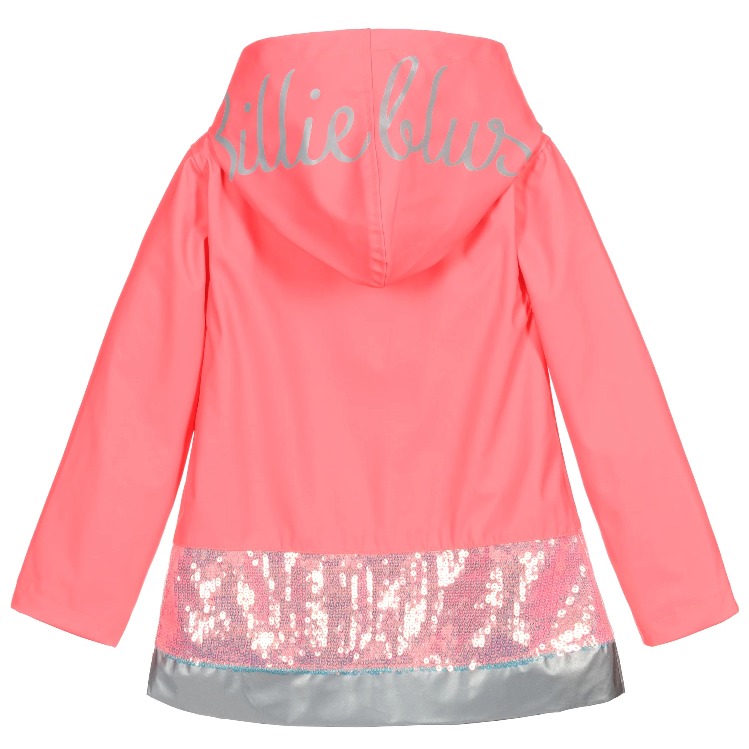 Neon pink hooded raincoat for girls by Billieblush, made in waterproof coated polyester. Lined in soft jersey, it has a zip fastener with a branded pull. The hood has reflective silver logo print and there is matching trim around the hem with iridescent sequins.