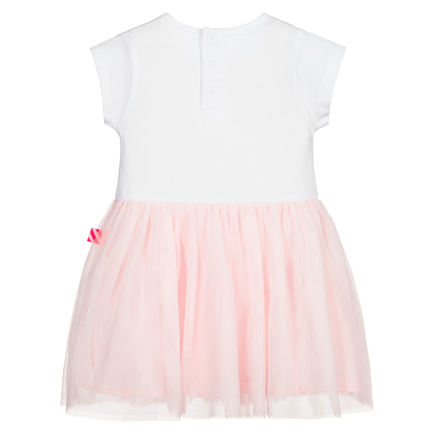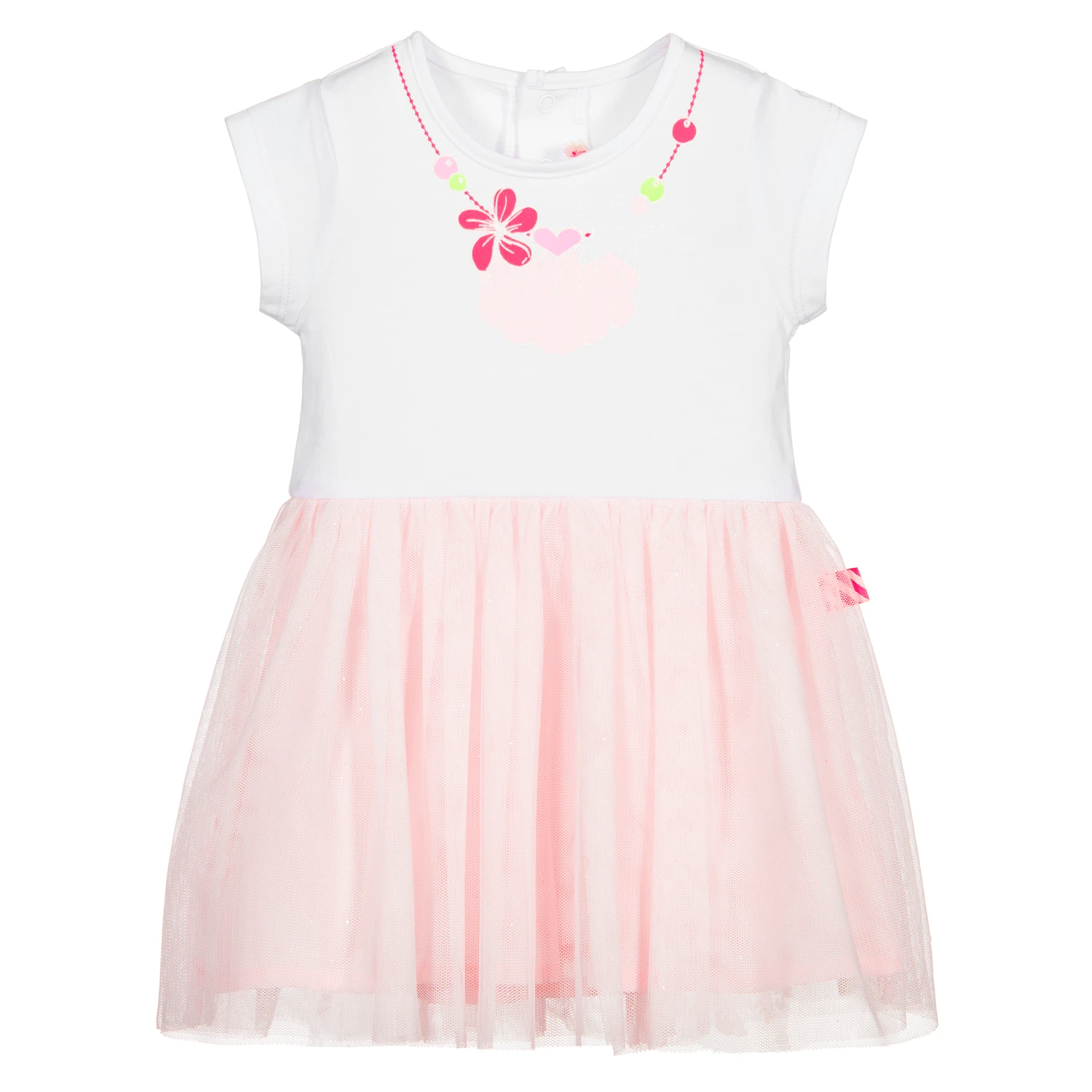 Cute dress for younger girls by Billieblush. The white bodice is made in comfortable cotton jersey and has a sparkling pink necklace printed on the front. The pink cotton skirt has pretty glittery pink tulle overlay. The dress has capped sleeves and useful popper fastenings on the back.