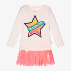Girls pink dress by Billieblush. Made with soft and stretchy cotton jersey, the bodice is decorated with a glittering star logo print in neon shades of orange, pink and yellow. There is a little bow on the dropped waist, and the tulle skirt has pretty navy blue glitter and a soft, lightweight viscose lining.