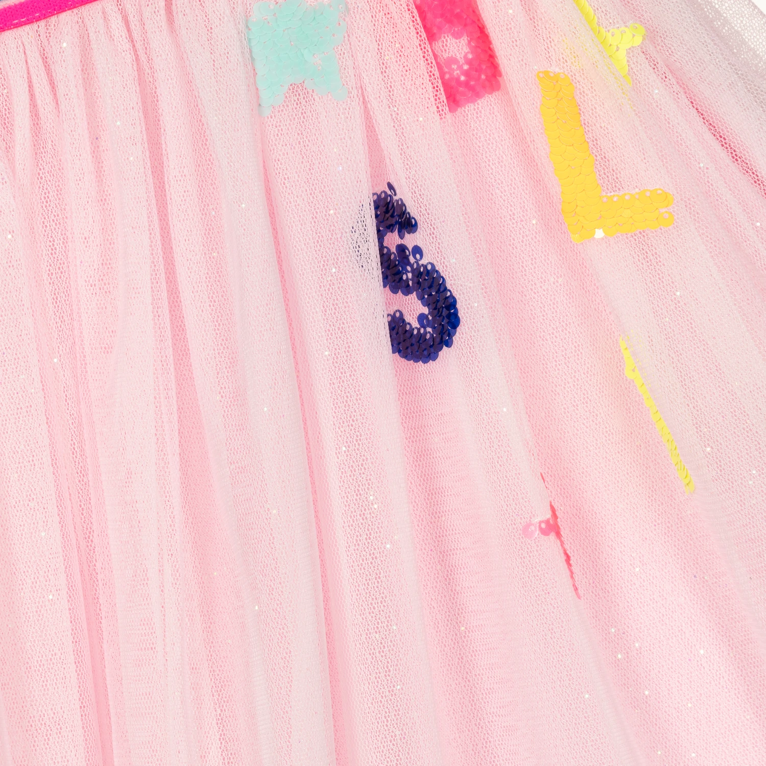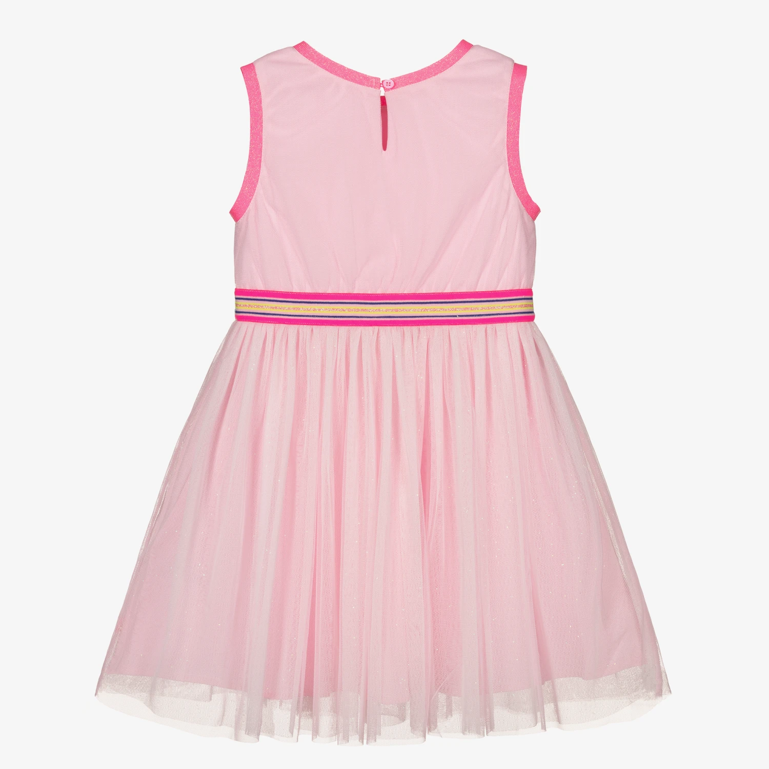 Quirky pale pink sleeveless tulle dress for girls, by Billieblush. Lined with super soft and lightweight viscose, it has fun and colourful ice creams and rainbow sequinned trims, and a striped colourful waistband.