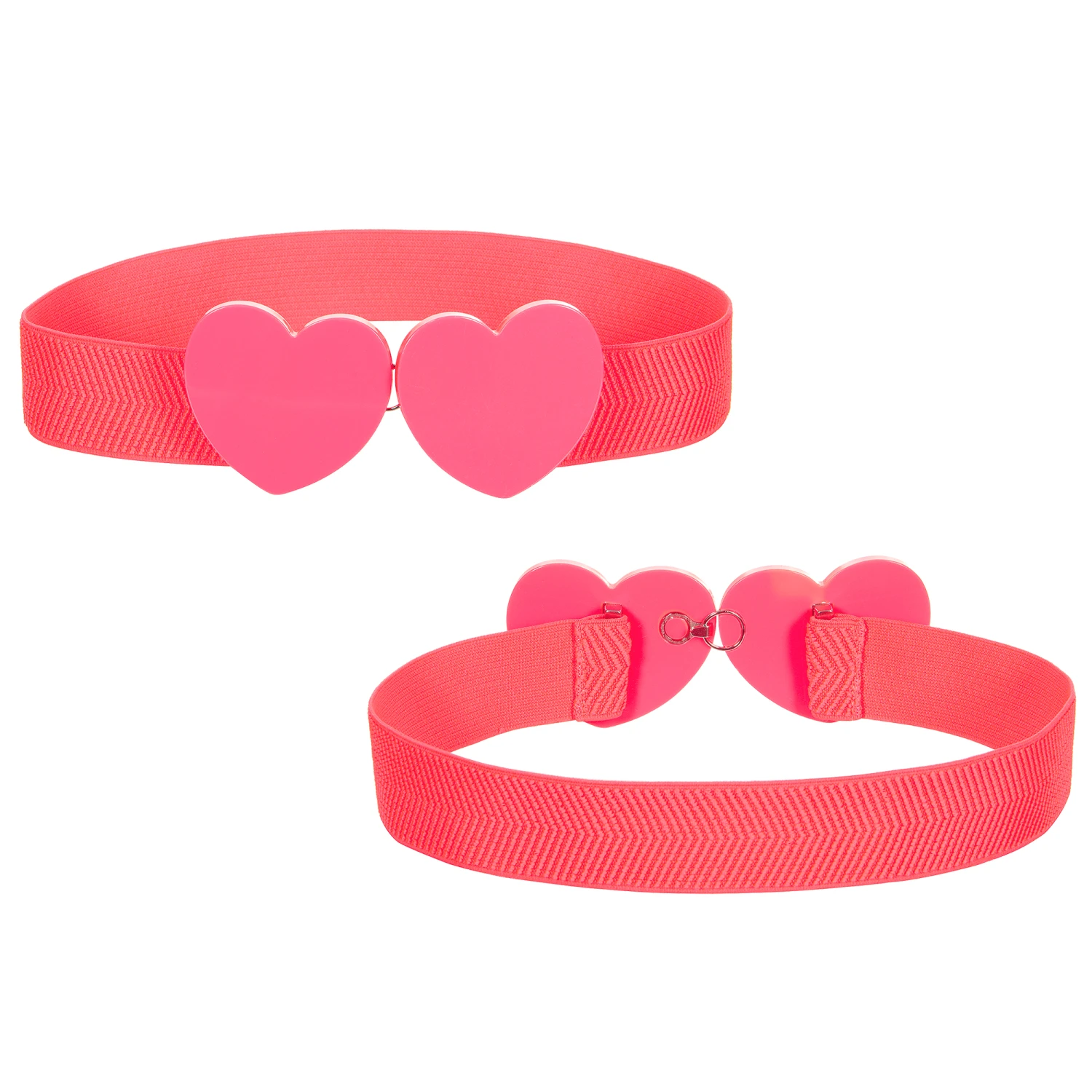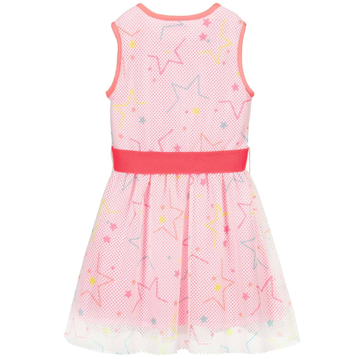 Girls pink and white mesh sleeveless dress by Billieblush. Made in soft polycotton jersey, the dress has neon pink trim and the white mesh overlayer is patterned with stars in neon print. The detachable, elasticated neon pink belt has a fun, heart shaped buckle.