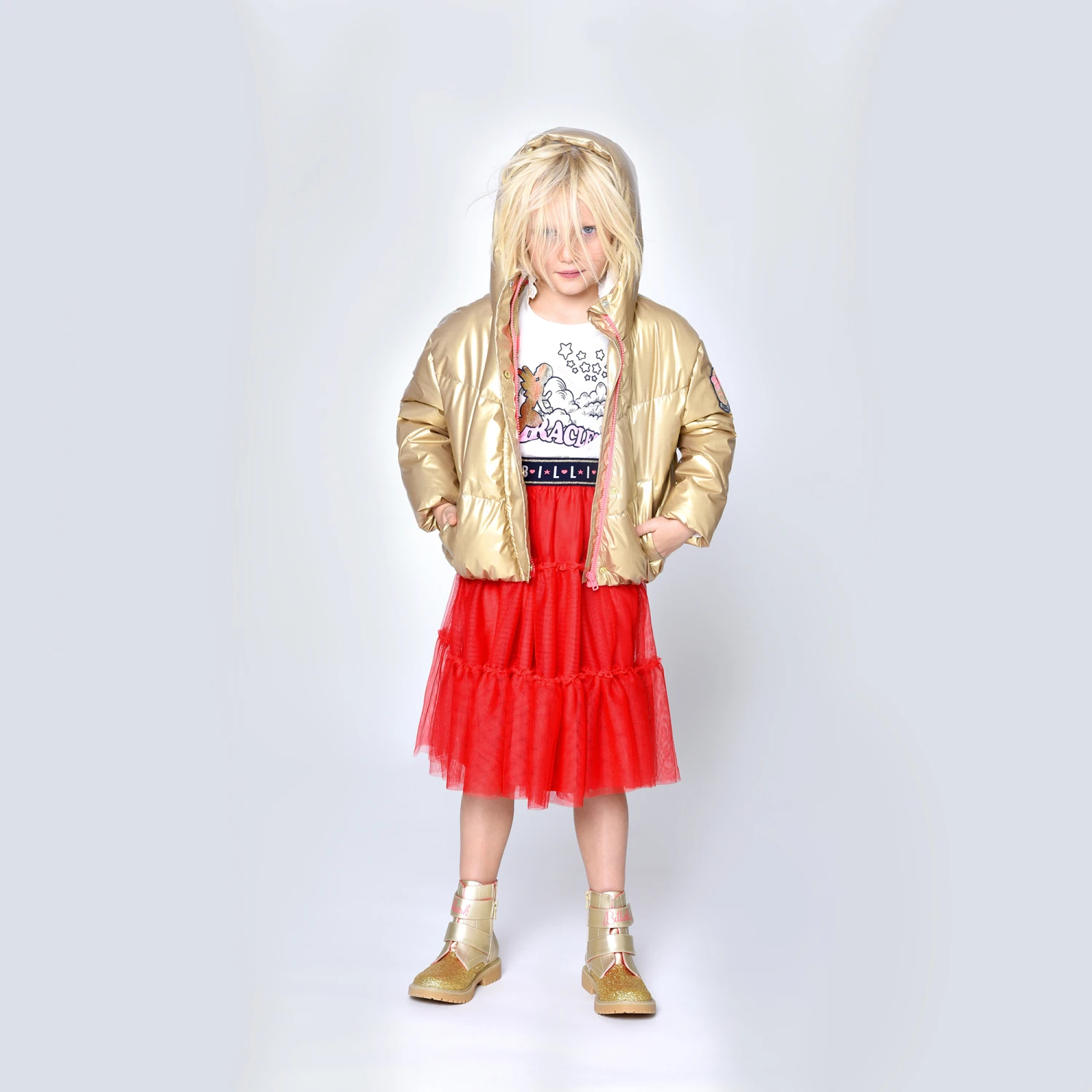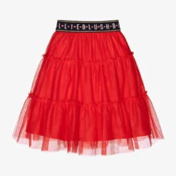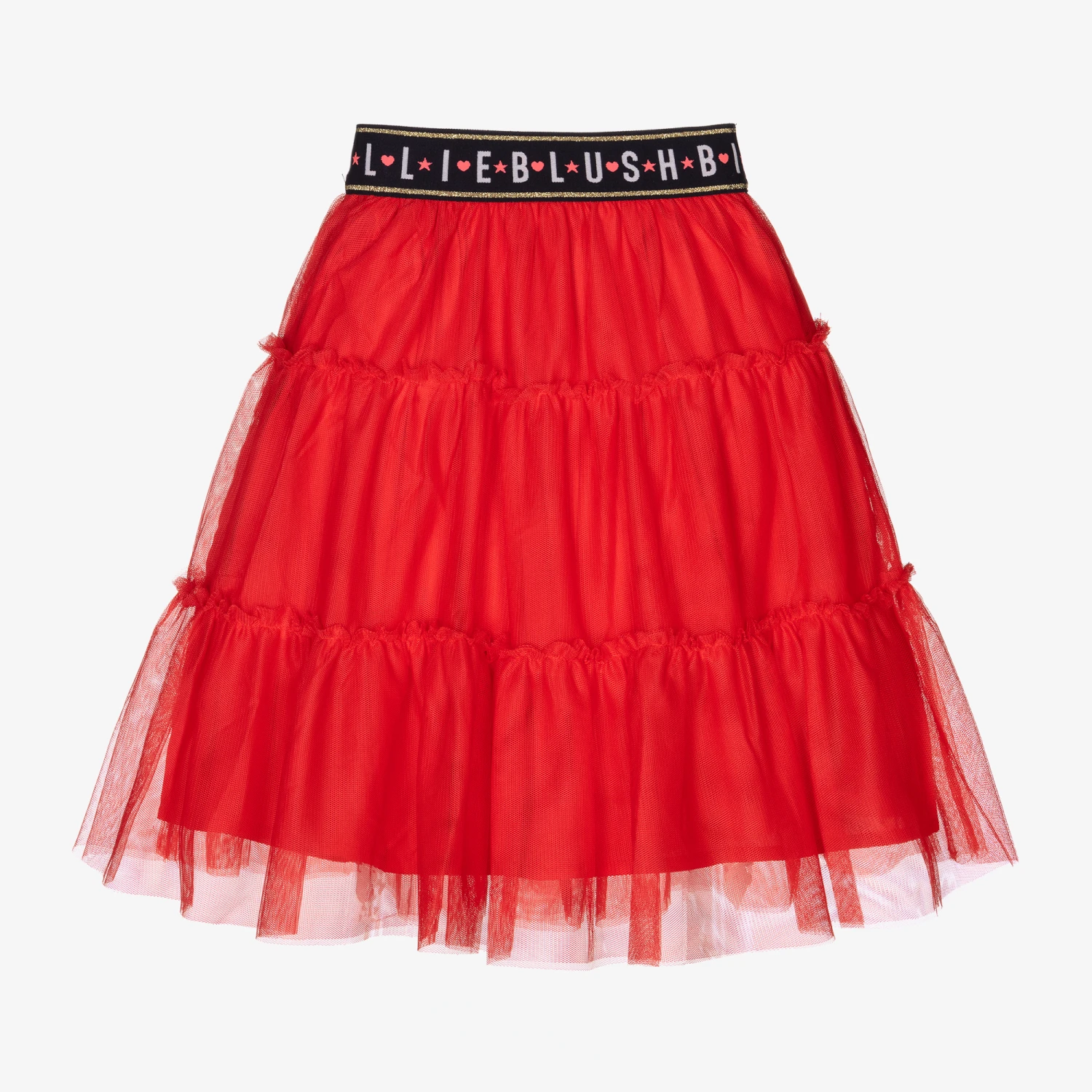 Red skirt for girls by Billieblush. Made in layers of soft tulle, this pretty tiered skirt has a silky soft viscose lining and a navy blue, neon pink and gold glitter elasticated logo waistband.