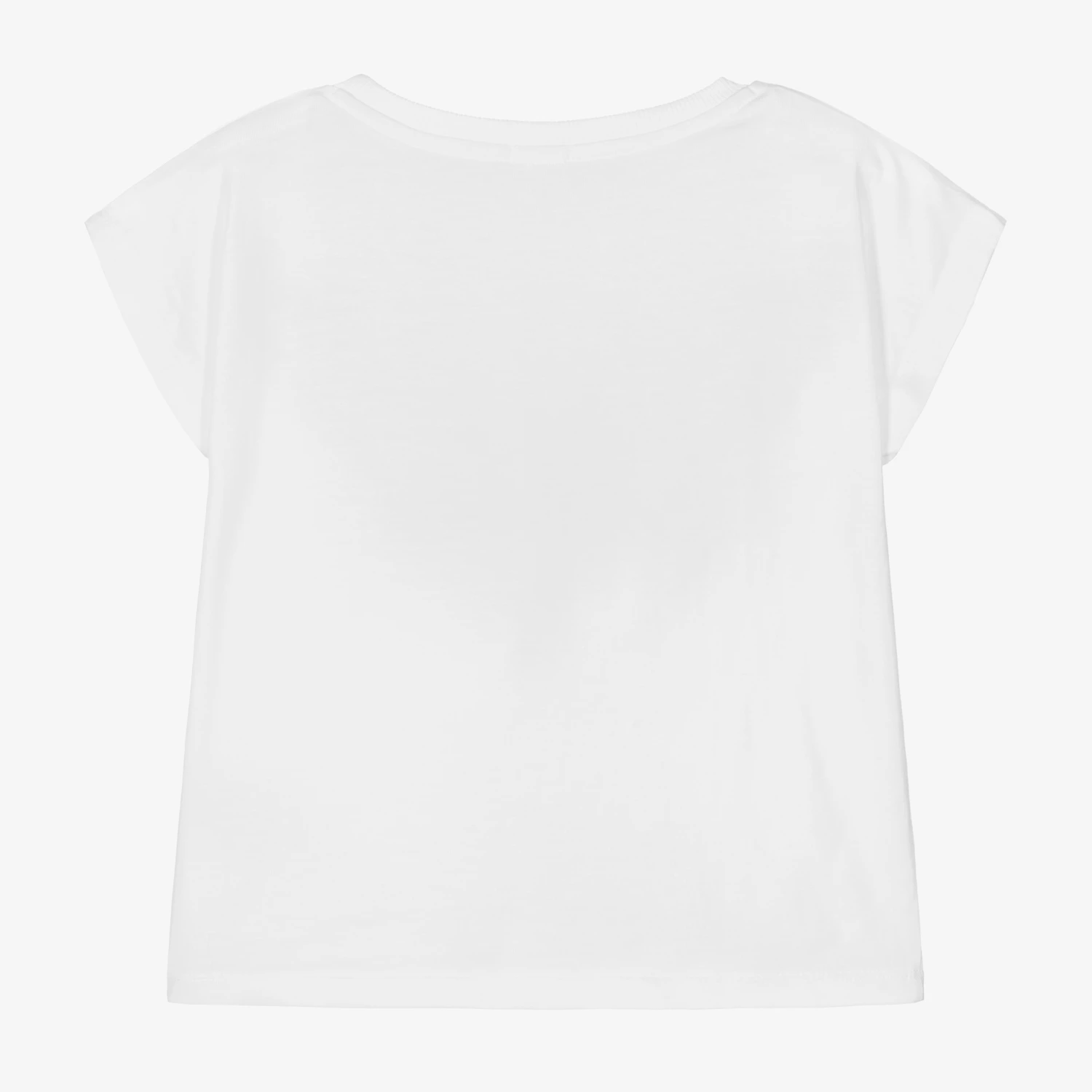 White cotton T-shirt for girls by Billieblush. Soft and stretchy, it has capped sleeves and a neon pink and orange ‘Happy Holidays’ print with a glittering flamingo motif and a a striped logo tab on the side seam.