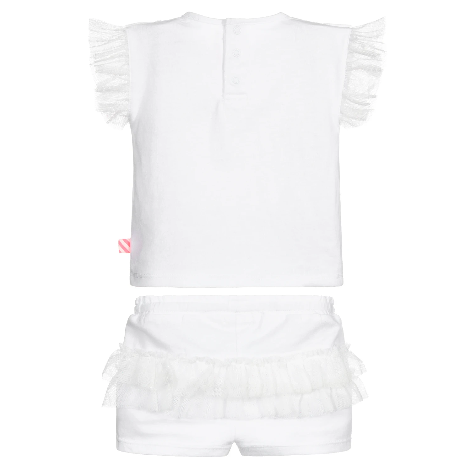 Sweet white shorts set for little girls by Billieblush, made in soft cotton jersey. The T-shirt has ivory glitter tulle trim on the sleeves and front, with a tropical dolphin print in neon pink and yellow. The shorts have an elasticated waistband and tulle frills across the back.