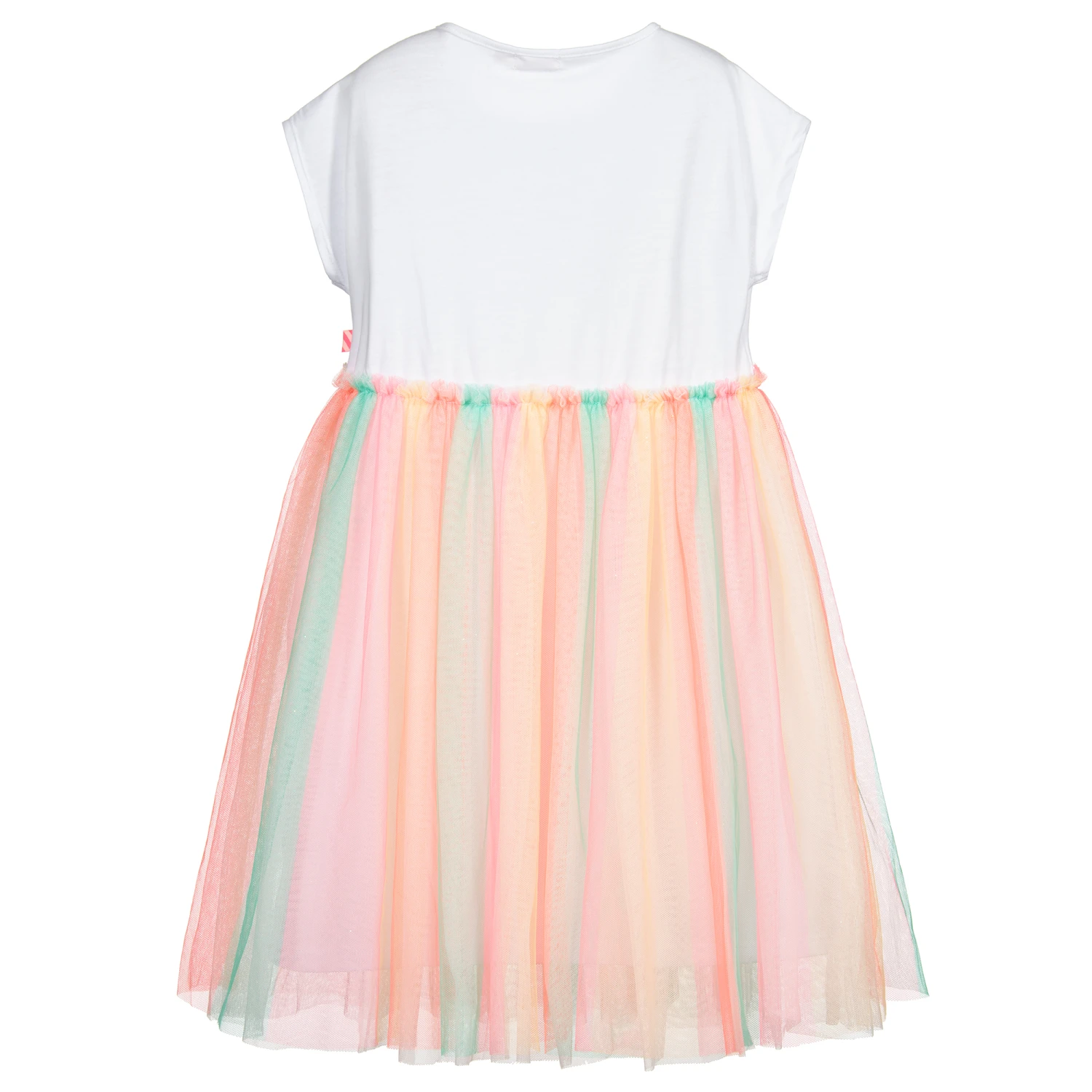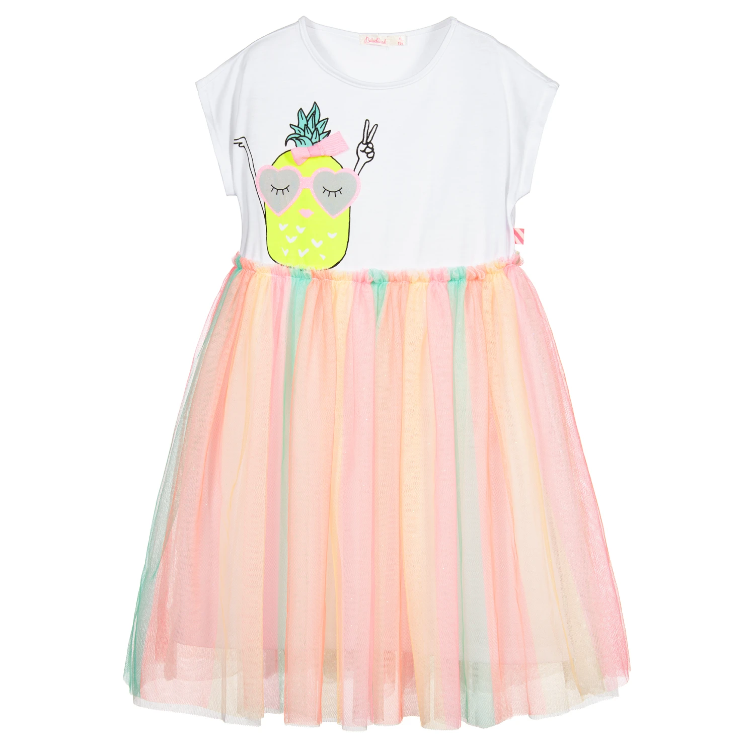 White dress for girls by Billieblush, made in soft polycotton jersey. It has a fun pineapple print in neon yellow, pink and silver, with a pink ribbon bow. The skirt has an overlay of gathered tulle in pink, yellow, orange and green, with a pretty iridescent sparkle.