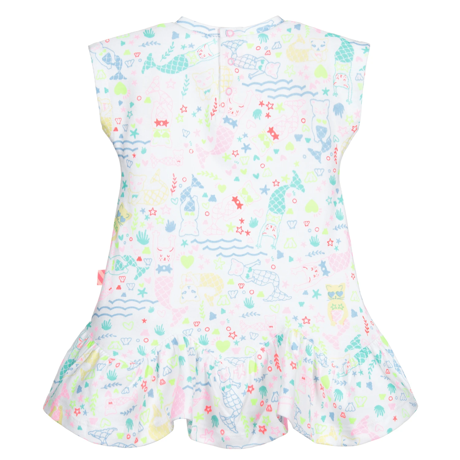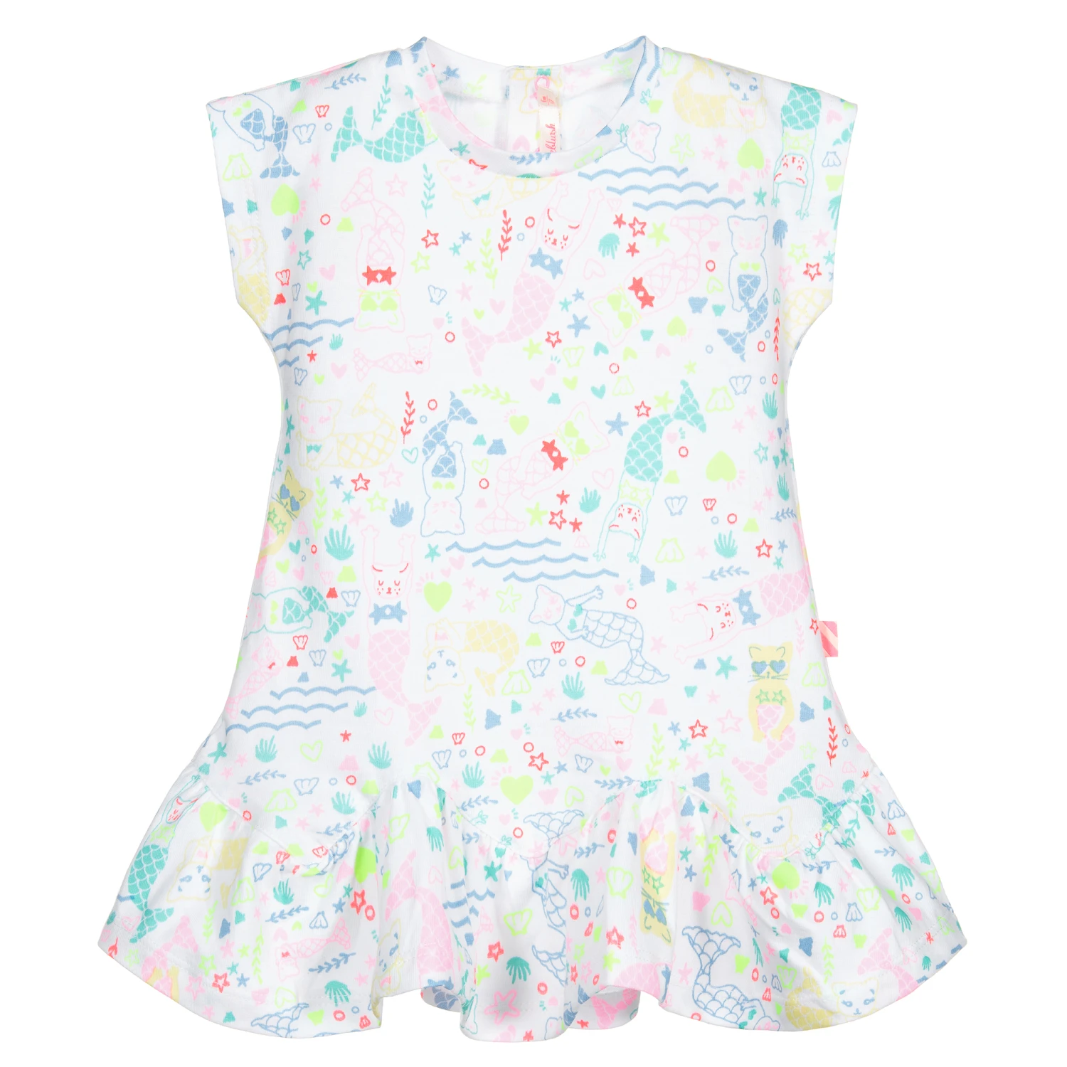 Sweet white dress for little girls by Billieblush, with a colourful mermaid cat print in neon yellow, pink, blue and green. Made in soft and comfortable cotton jersey, it has a ruffled zigzag hem and fastens with poppers on the back.