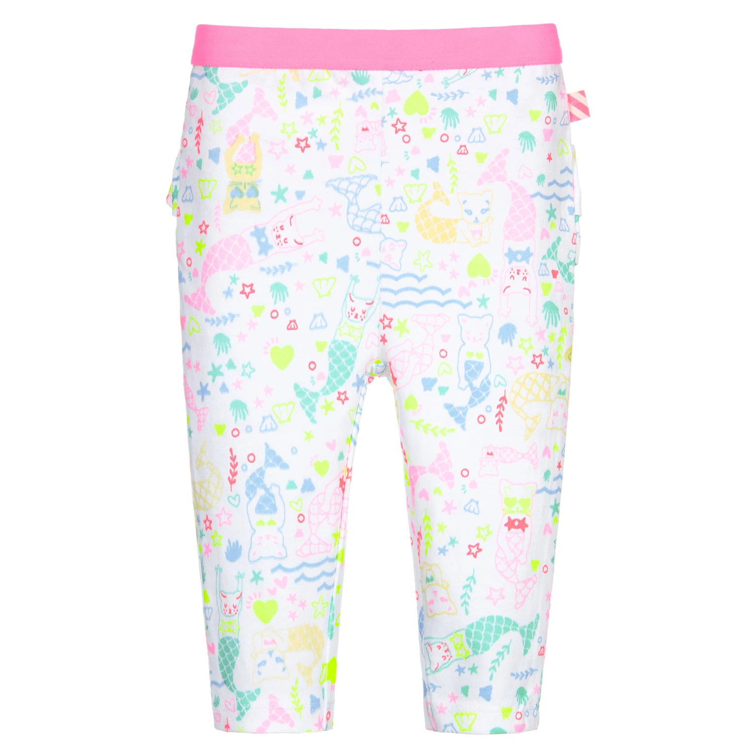 Sweet white leggings for little girls by Billieblush, with a mermaid cat print in pink, blue, yellow and green. Made in soft and comfortable cotton jersey, they have an elasticated waistband and pretty frills across the back.