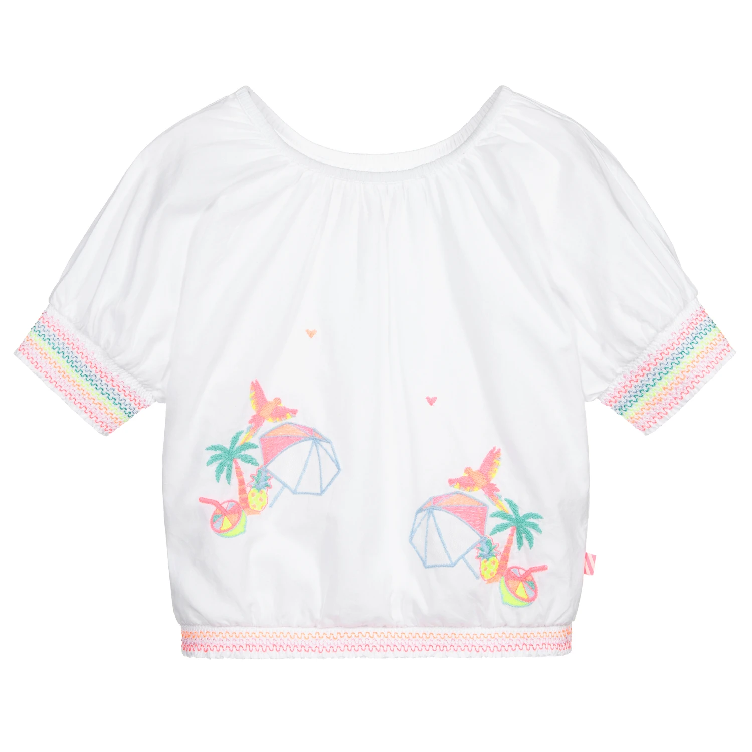 Pretty white blouse for girls by Billieblush, made in a double layer of white cotton voile. Gathered from the elasticated neckline, it has smocked cuffs and hem with colourful neon embroidery. There are embroidered tropical designs on the front in matching neon thread.
