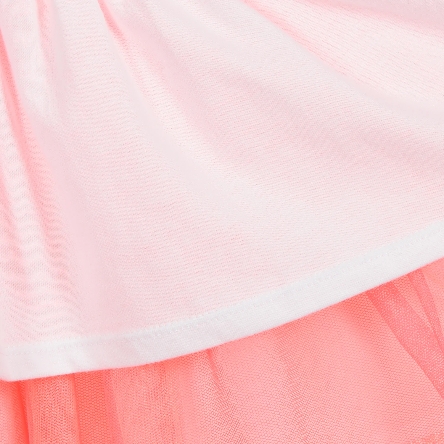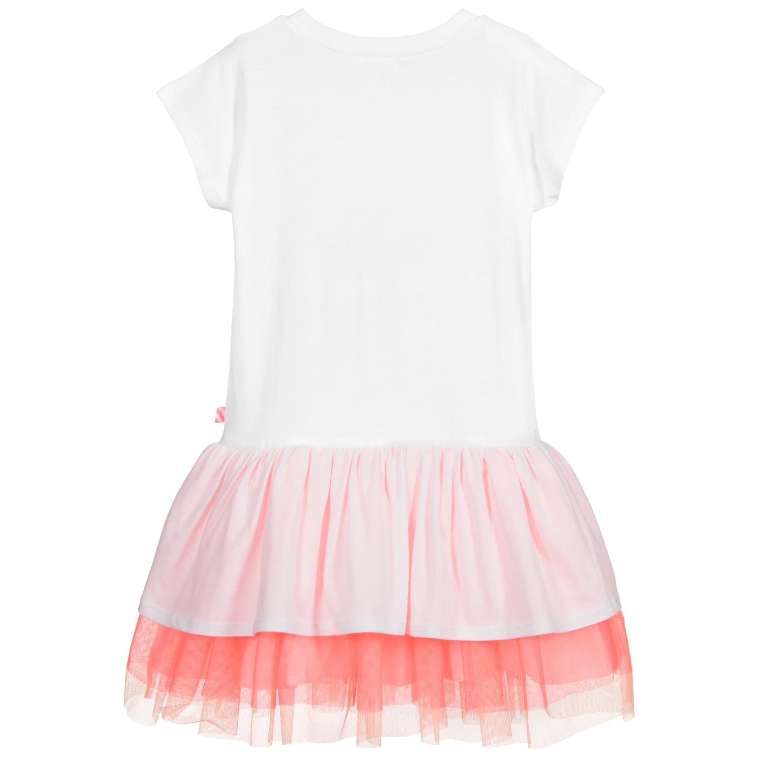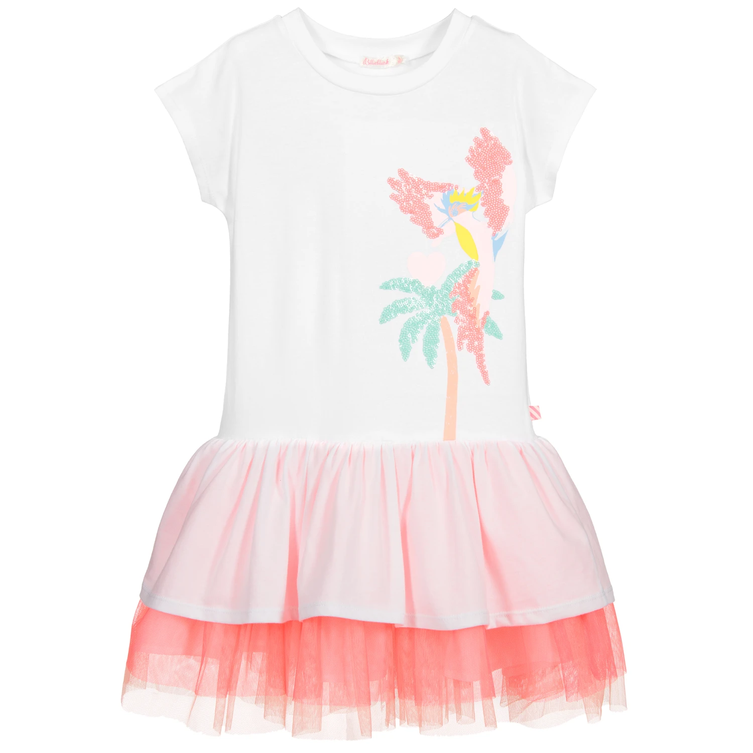 Girls white jersey dress from Billieblush, made in soft and comfortable cotton jersey. It has a lovely bird design in neon pink, pale pink, green and blue, with shiny sequins. The dropped waist, gathered skirt has layers of neon pink tulle and is lined in lightweight cotton voile.