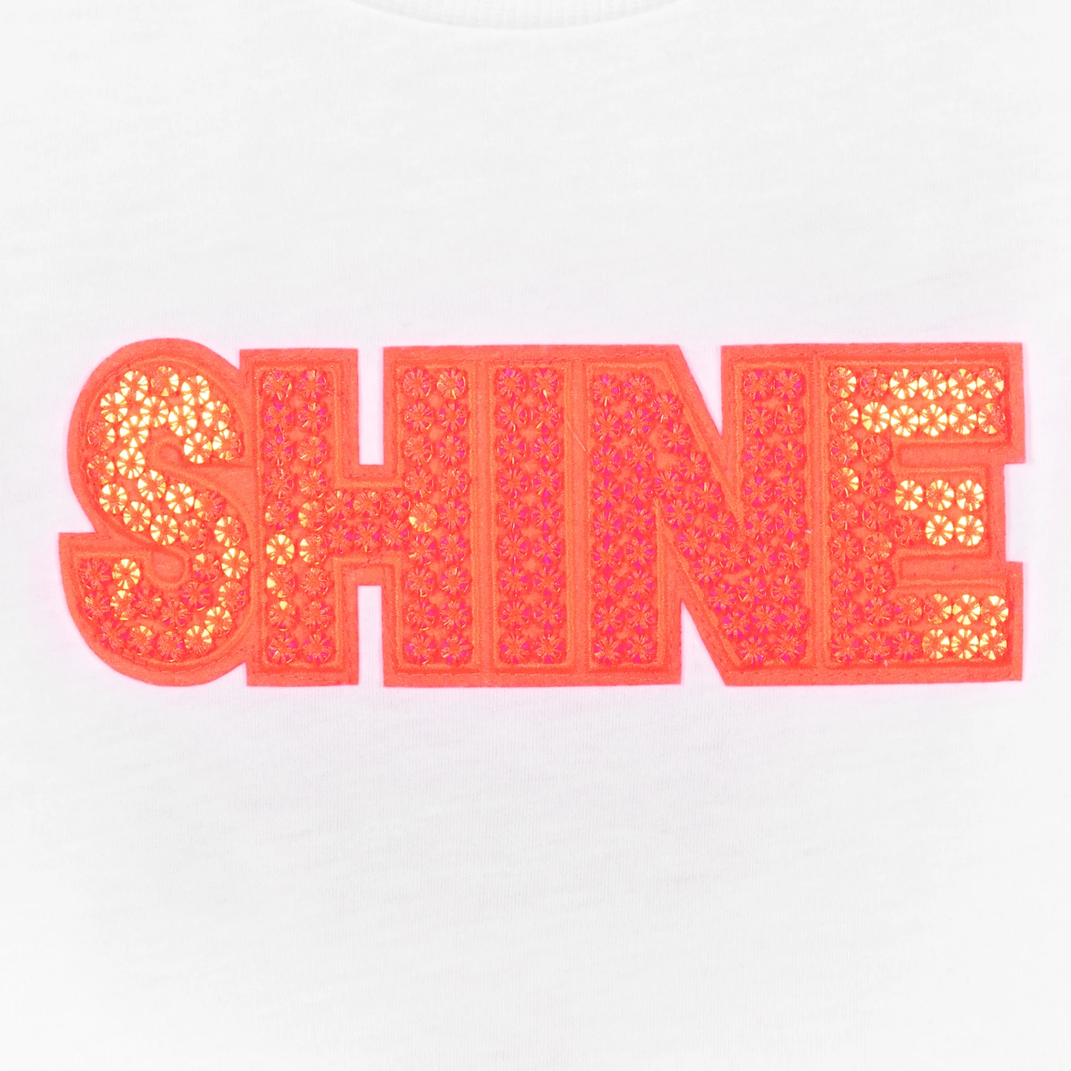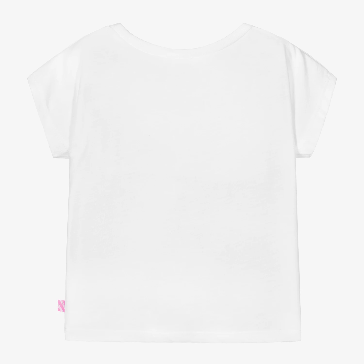 Girls white T-shirt by Billieblush, made in soft polycotton jersey. In a casual boxy fit, it has a neon pink ‘SHINE’ appliquΓ© on the front, with a ribbed neckline.