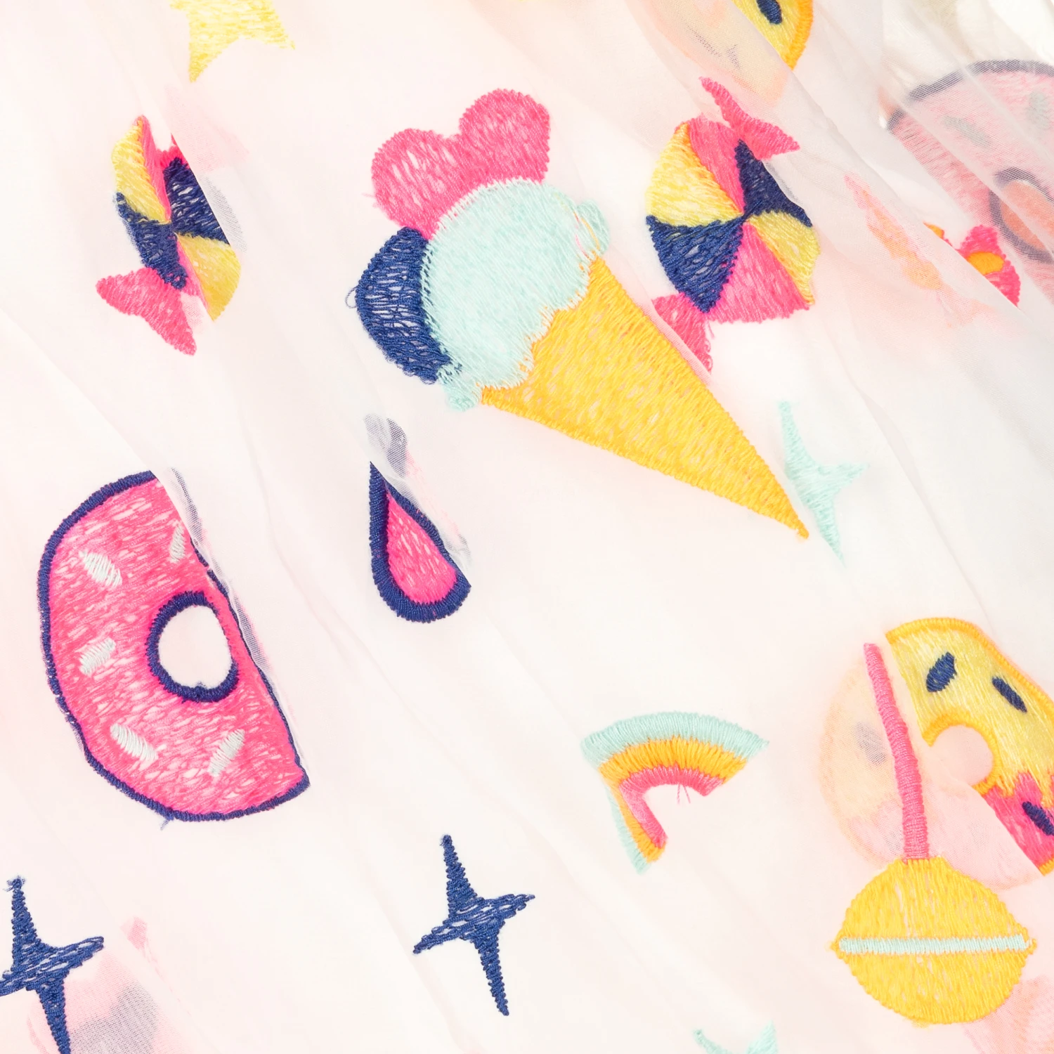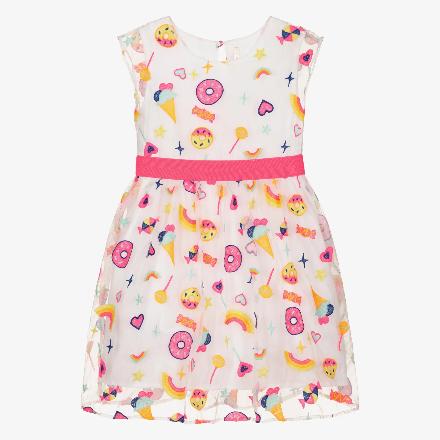 Quirky white organza dress for girls, by Billieblush. Lined with soft, lightweight cotton, it has a fun embroidered ice cream, donuts and sweets design in neon colours. With stylish capped sleeves, it also has a pink ribbon waistband for a lovely shape.