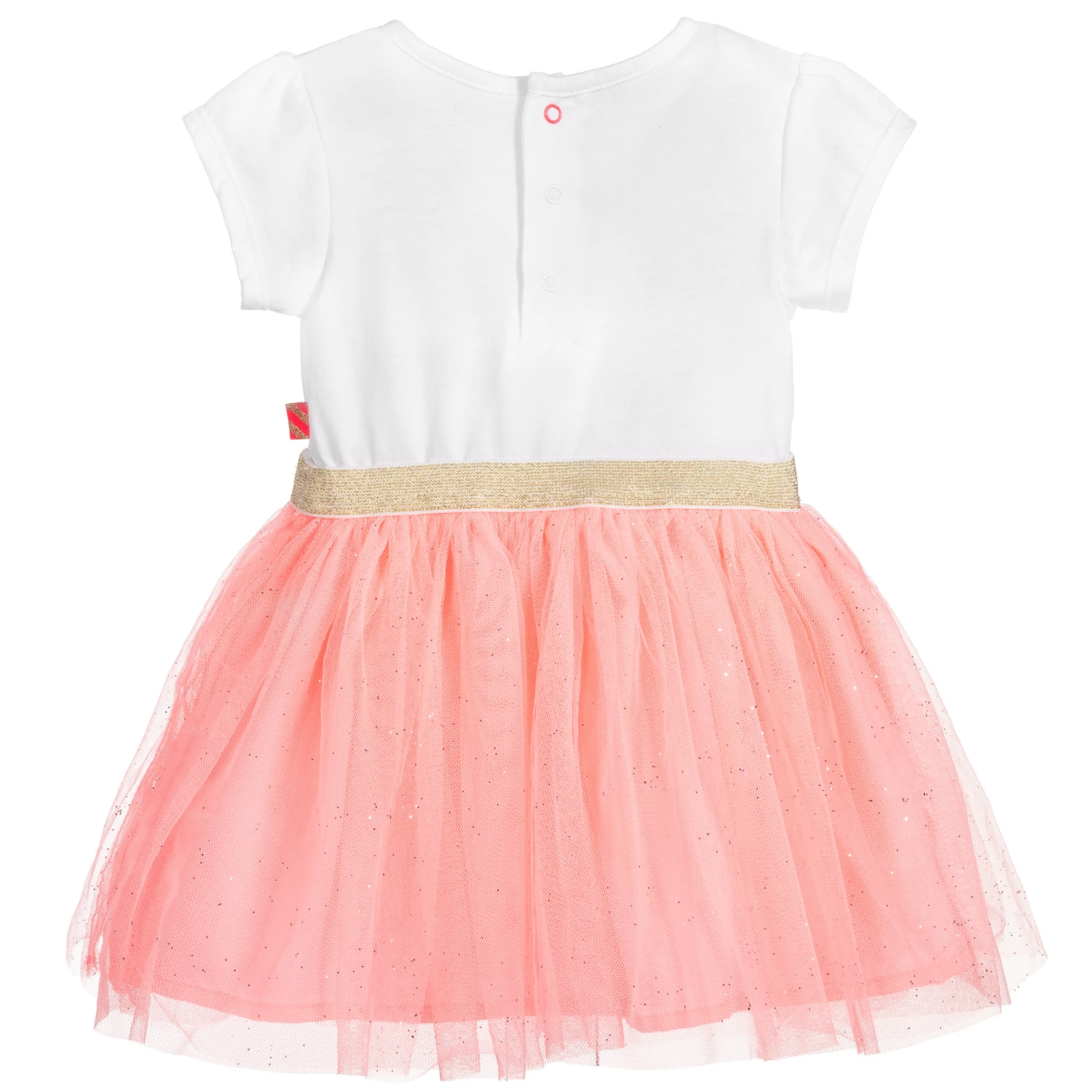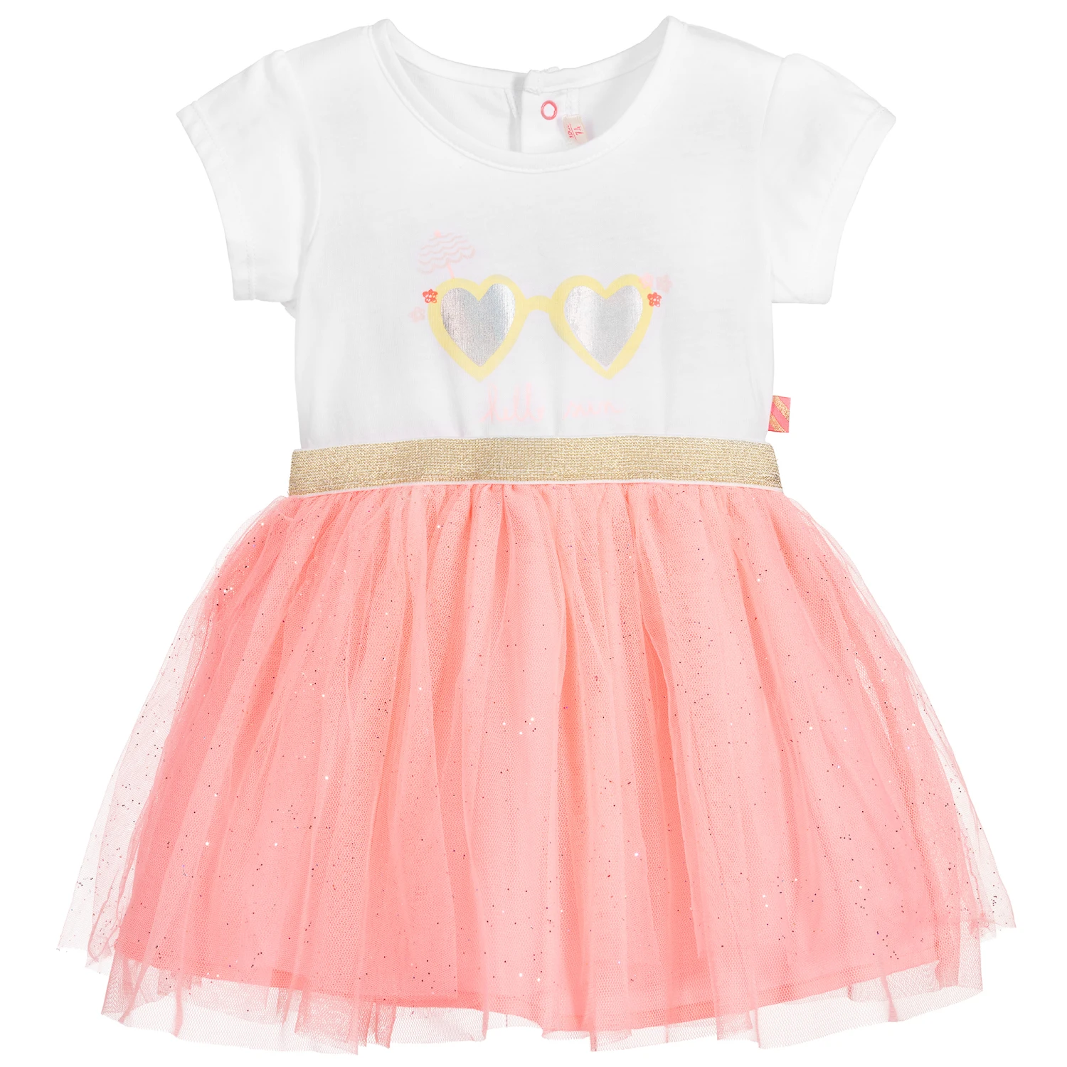 Fun for younger girls, a white cotton jersey dress by Billieblush, with a sparkly neon pink tulle skirt. Soft and lightweight, it has a stretchy gold waistband and cute sunglasses motif printed on the front.