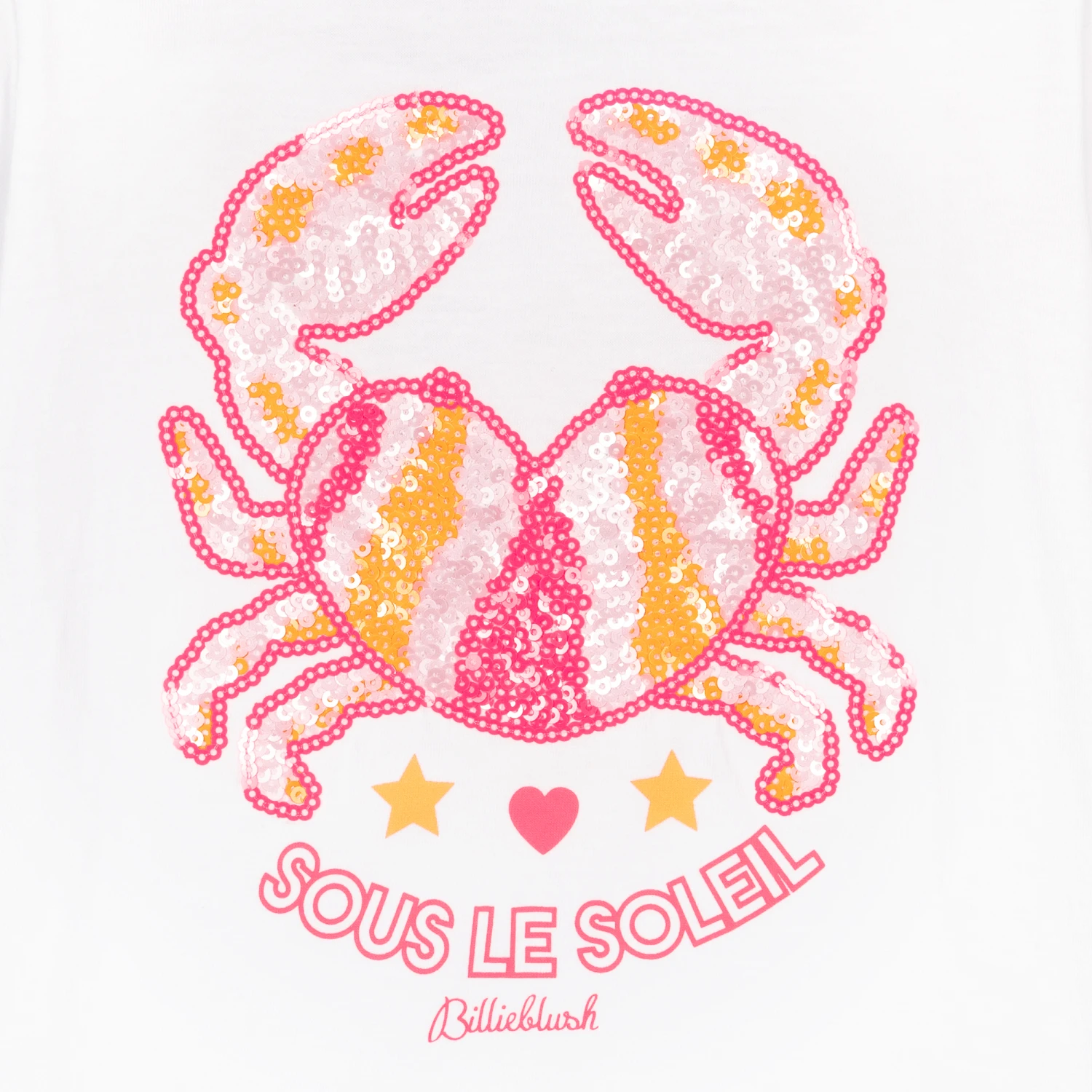 White T-shirt for girls by Billieblush. Made with soft cotton jersey, it has a neon pink and orange sequinned crab motif with a French printed slogan on the front.