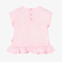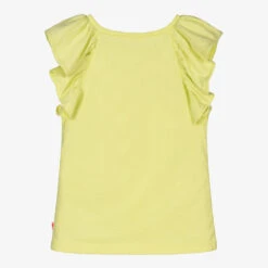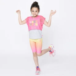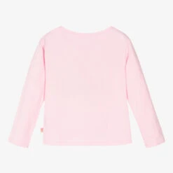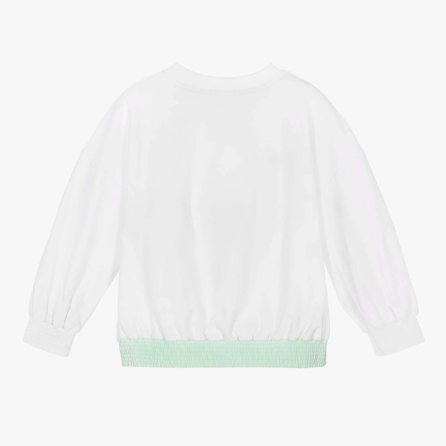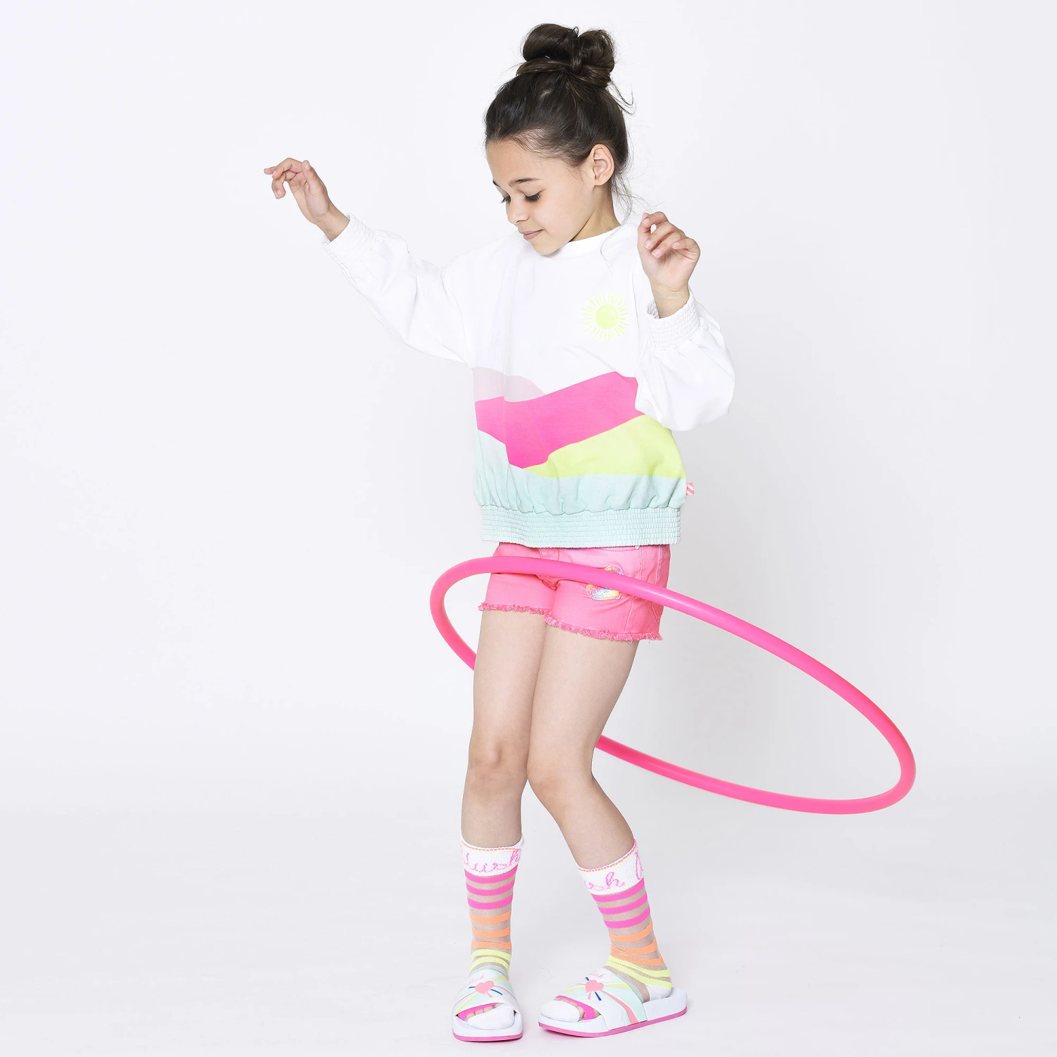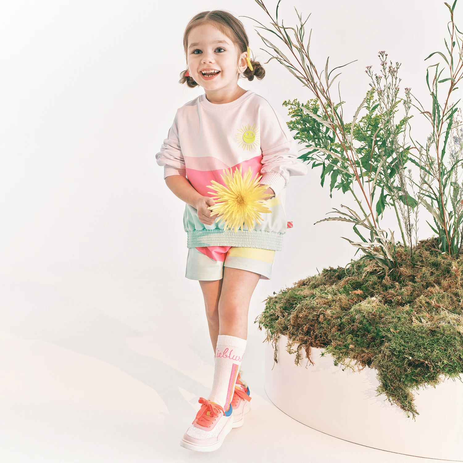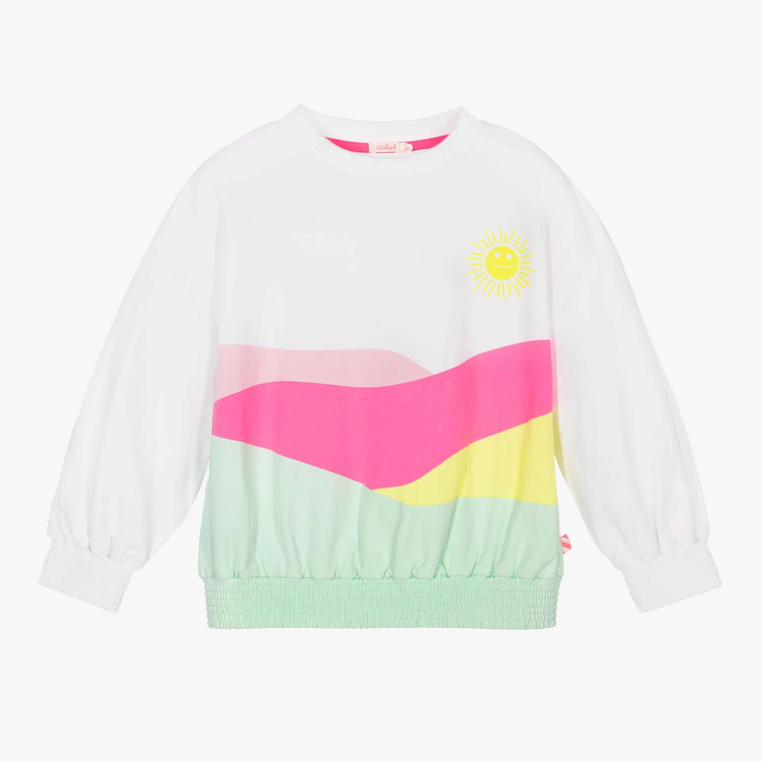 White cotton sweatshirt for girls by Billieblush. Made with soft and stretchy, lightweight jersey, there are pretty pink, yellow and mint green abstract stripes with a neon yellow smiling sun motif and a shirred elastic hem and cuffs.