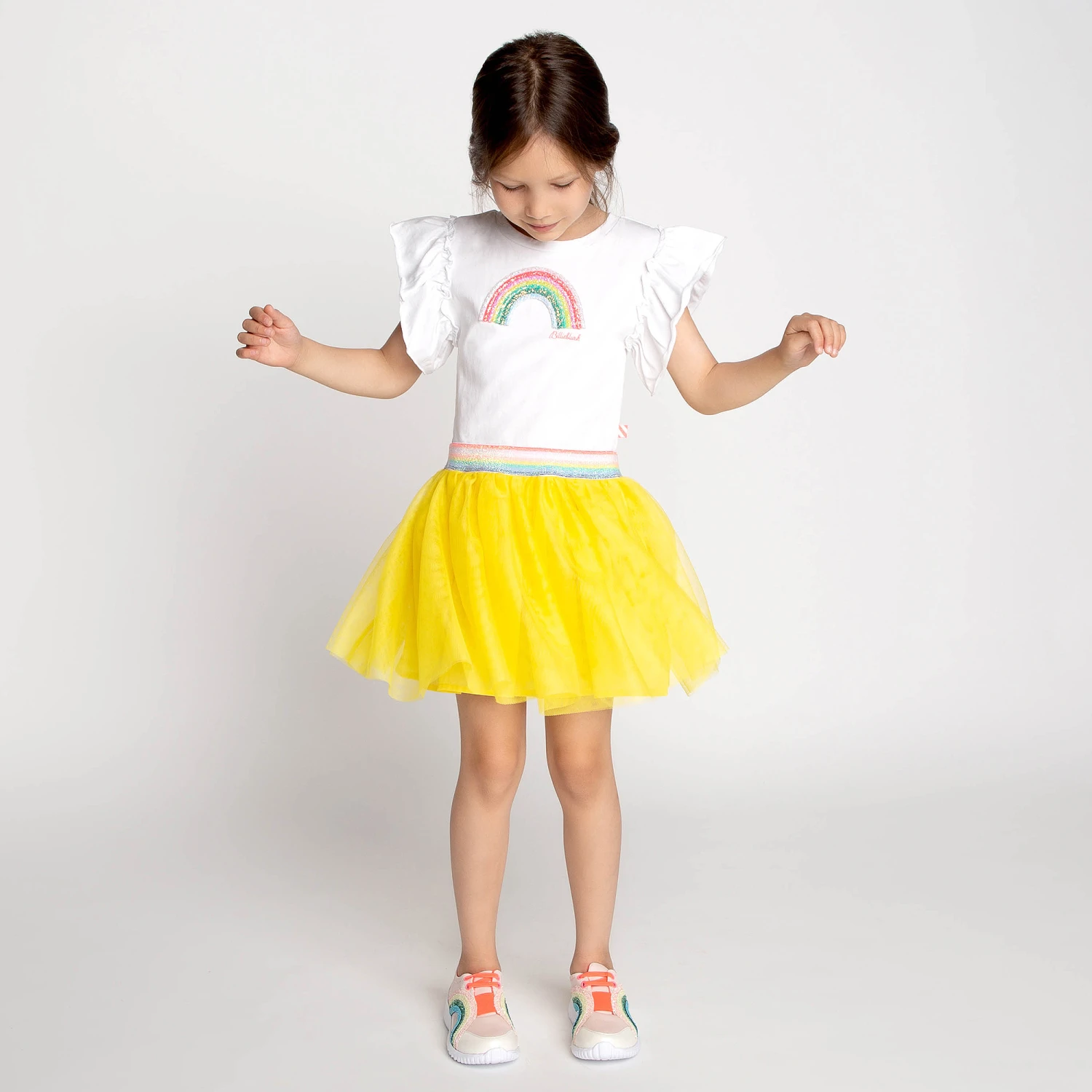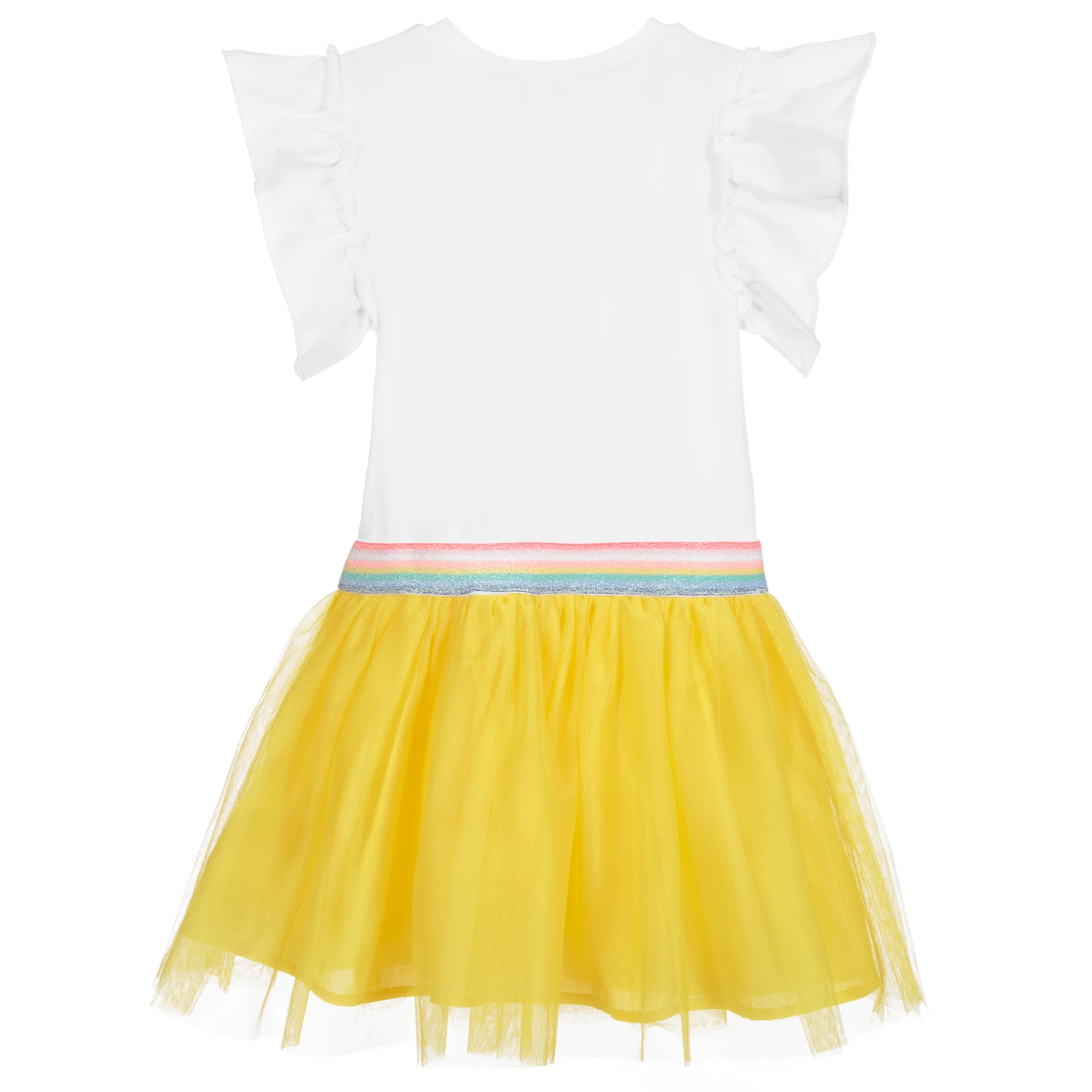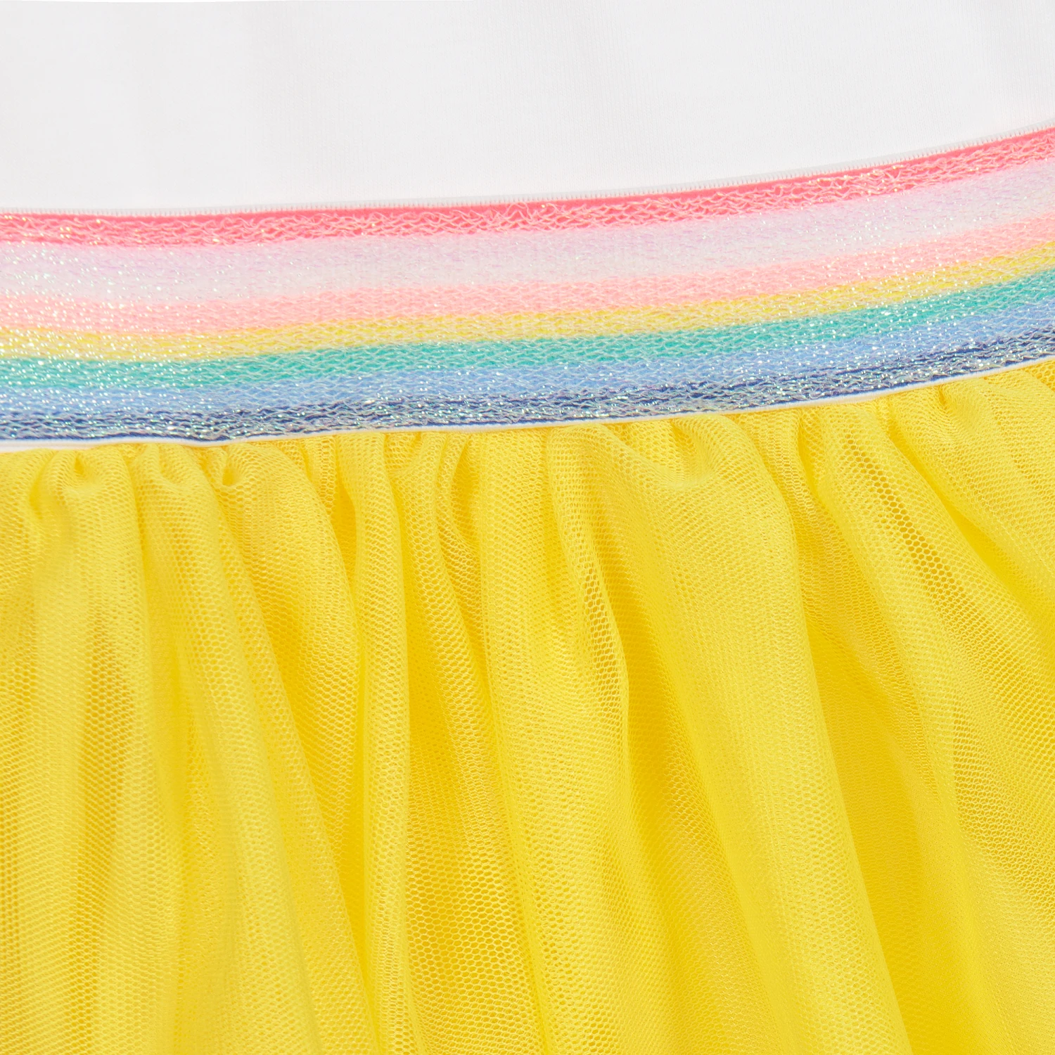 Girls white and yellow dress from Billieblush. Made in soft cotton jersey, the top has a glitter rainbow design, pretty frilled sleeves and a rainbow elasticated waistband with sparkly thread. The skirt is made in layers of soft tulle, with a lightweight cotton lining.