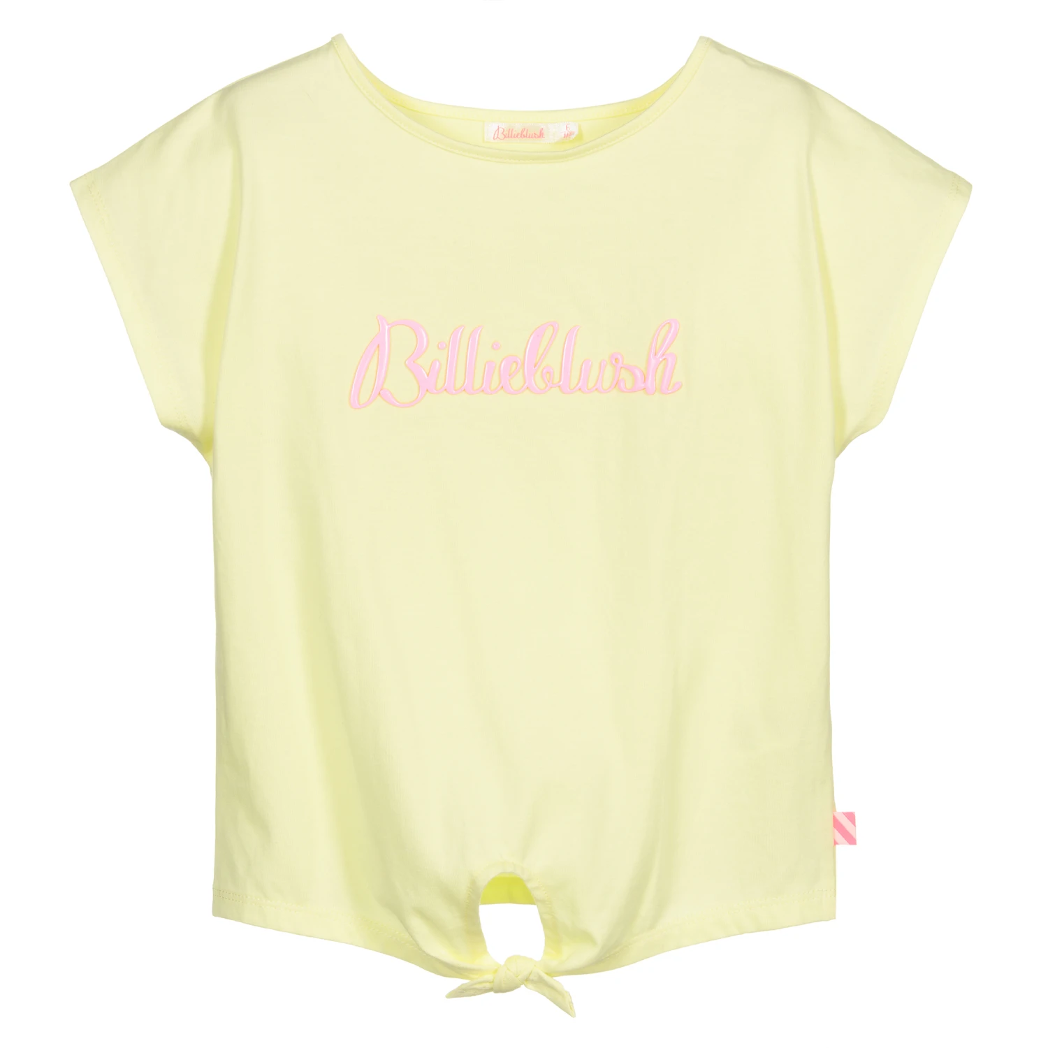 Yellow T-shirt for girls by Billieblush, with a pink rubberised logo print across the front. Made in soft cotton jersey, it has a tie detail on the front hem and the brand’s signature neon pink logo label on the side seam.