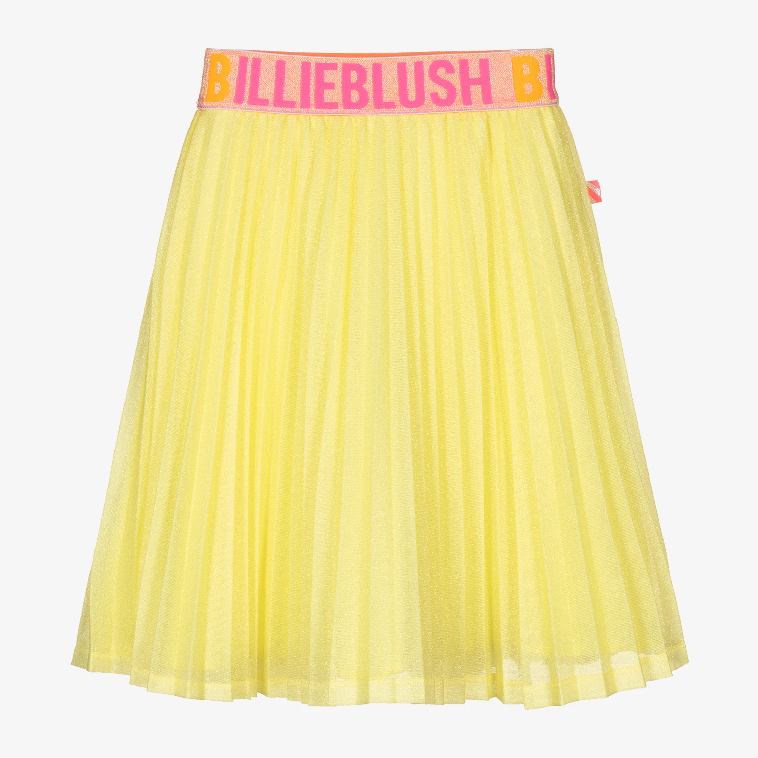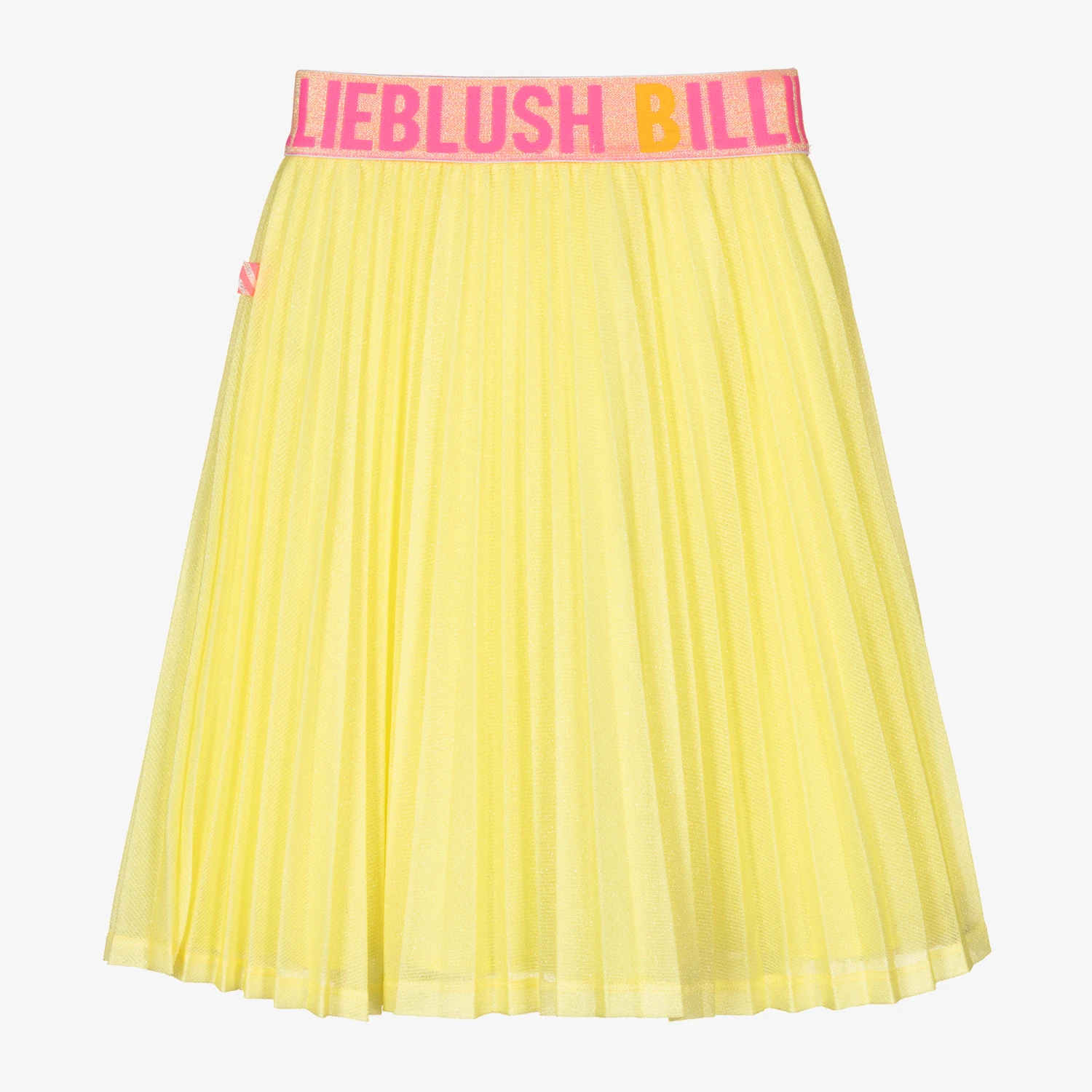Bright yellow pleated skirt for girls by Billieblush. It is soft and stretchy, with pretty glitter flecks and a sparkly logo jacquard waistband in neon pink and orange. It is lined with soft, lightweight fabric for comfort.