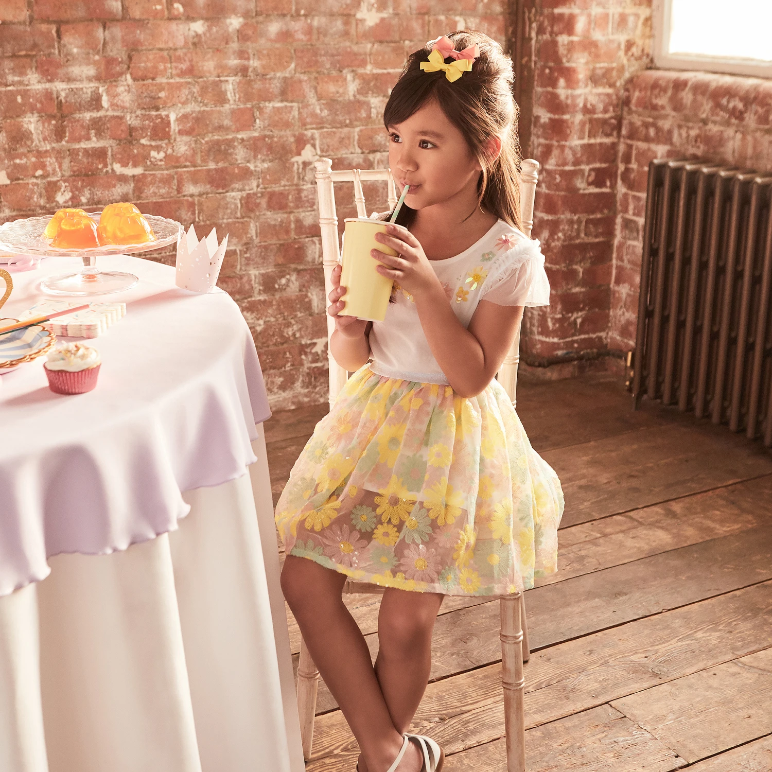 Shimmering yellow, green and pink skirt by Billieblush. The white tulle overlay is patterned with sequinned flowers and lined with soft, lightweight viscose. It has a comfortable, white elasticated waistband, glittering with iridescent thread.